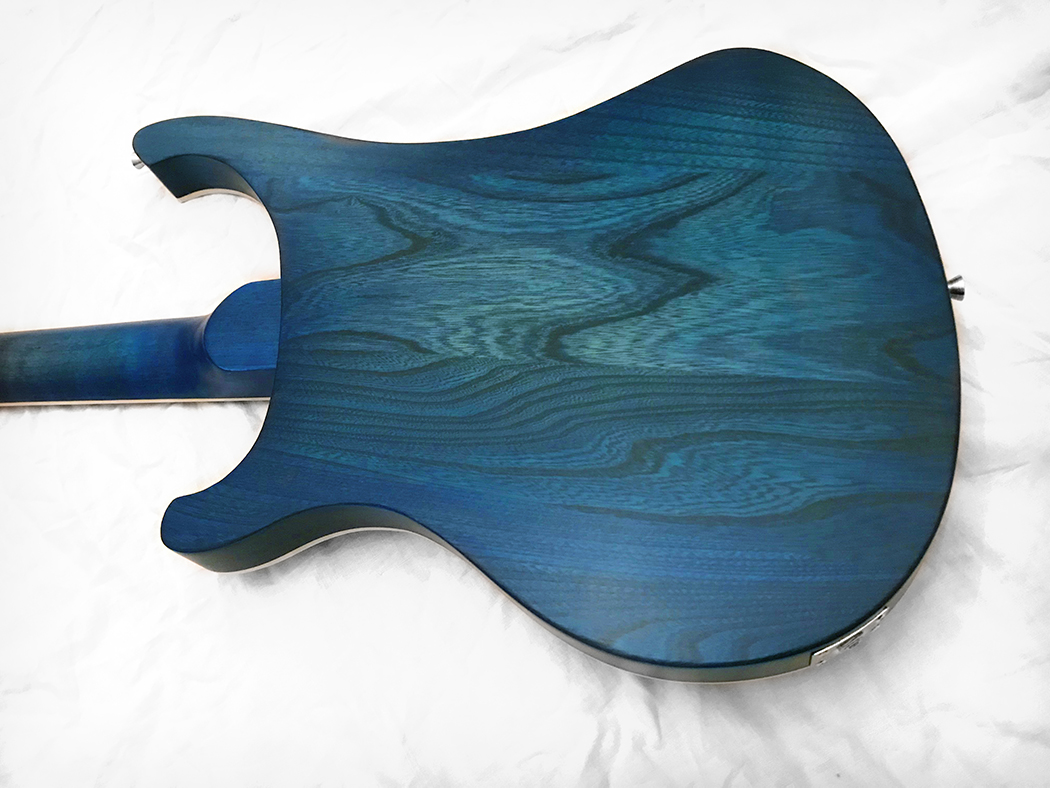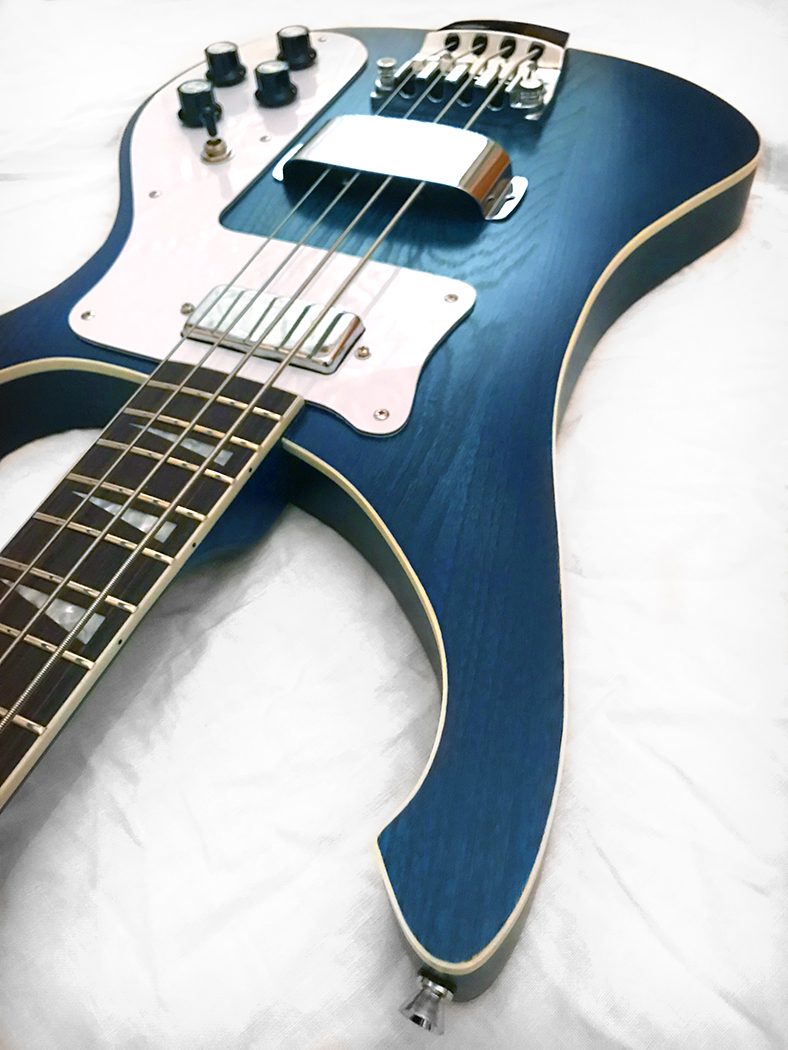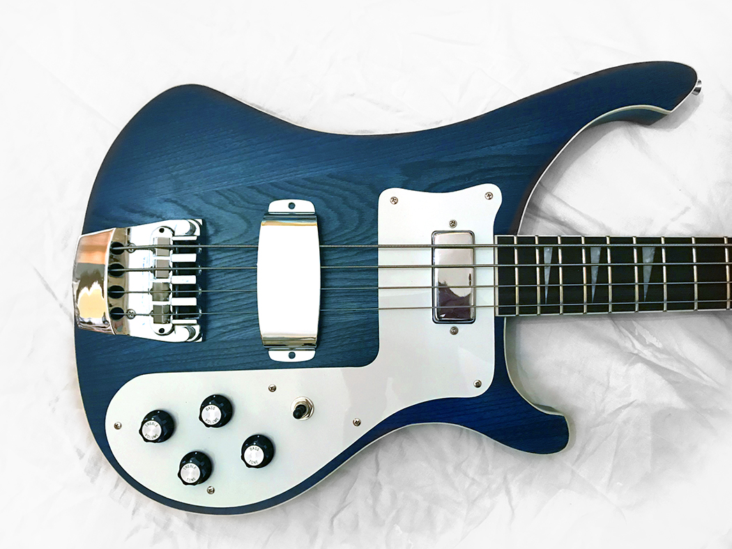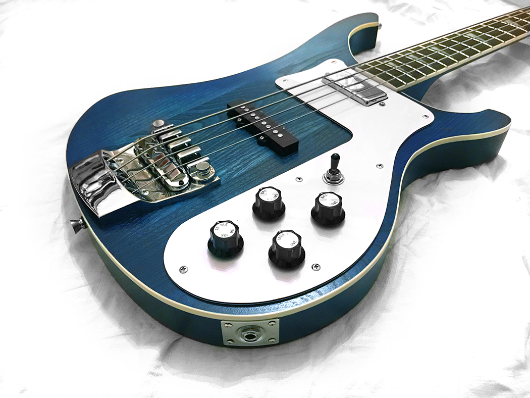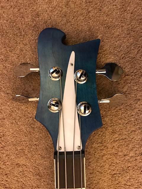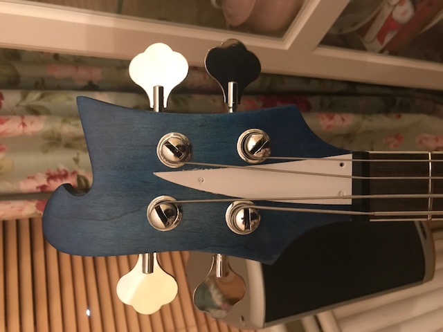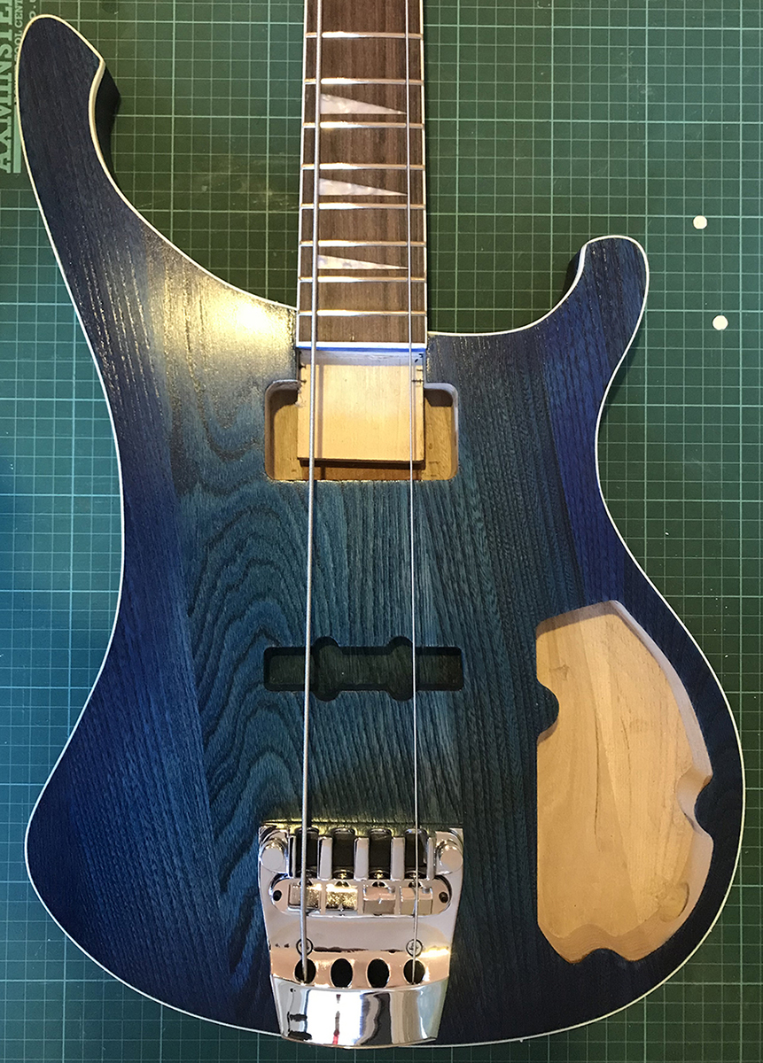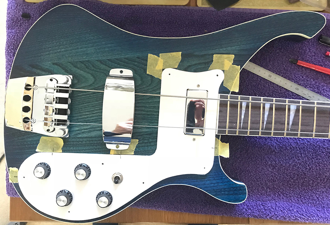 It was a stock RC4 kit build with an Allparts Ric style bridge upgrade and different knobs as I chipped the supplied ones when I first took them off. I had to make a new scratch plate as the supplied one didn't fit once I set the neck in place for a 34" scale length. I made a larger truss truss rod cover from an offcut of scratch plate material with custom 3D printed logo. At every step of the way I found myself buying an new tool or 'thing' – I'll try to list them with a total spend soon. Most probably weren't totally necessary as Ive got a well appointed garage workshop already although most of this build (with the exception of all of the sanding) generally took place on my dining table. The last purchase was a hard case to get it to the gig as all of my other cases didn't fit either the body shape or weren't deep enough to accommodate the angled headstock.