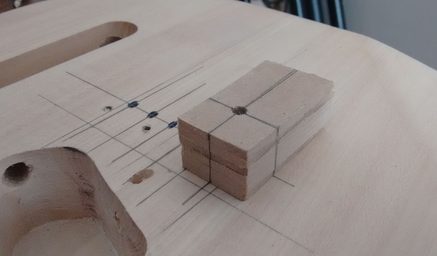 I was hoping to get the intonation definitely sorted before drilling the string-through holes but now I'm going to bite the bullet and rely on my measurements have got me safely in the ball-park.