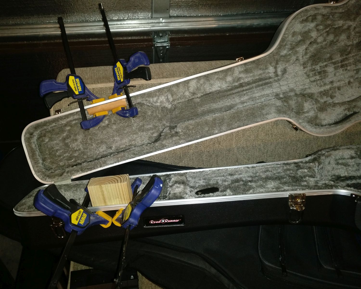I finally reconciled myself to the fact that no one makes a case like the Jack Casady...just a tad longer. So I would need to mod a case. The one I decided to mod is a Road Runner RMMBA17 acoustic bass case. It had two issues. One is that the headstock area was a little too small for the E-string elephant ear. On the good side there was a good amount of space between the top of the headstock and the top of the case. In a well-fitting case, nothing touches the headstock with the case closed. The heastock would probably fit if I could remove some of the polystyrene-like foam next to the tuner. The solution turned out to be easier than that. When compressed, this foam stayed compressed. So, I clamped it overnight and got a good indentation around the E-tuning peg.