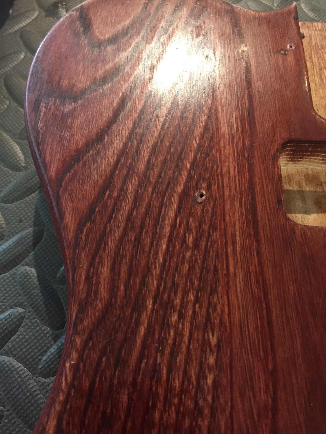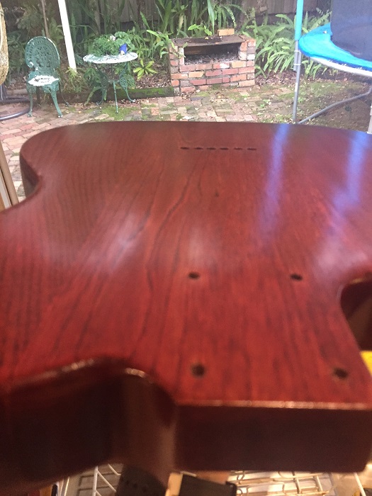 After a about somewhere between 6 and 9 thin DT final coats and a further 21 days of curing time I managed to wet sand through the finish, the intensifier and stain coats in an attempt to level the finish. I only lightly used 600 grit and 1500 grit.