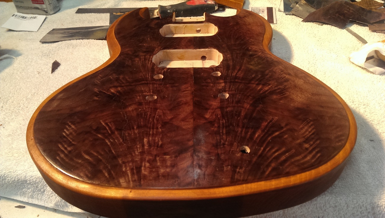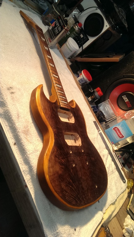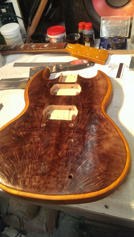 Gave the neck only 2 thin coats of wipe on poly, a light sand with 1,000 grit and one more thin coat. It looks good, matt finish but it has highlighted the grain without a heavy buildup of poly.