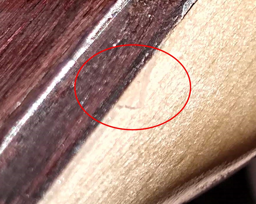 I haven't sanded the edge where the clear meets the fretboard yet (just hitting the two week mark since I finished spraying). Today I noticed a small chip where the tape has lifted away a spot of clear. It was hard to get a good photo so I had to enhance the edges and draw a circle around it. The chip is about 5mm long.