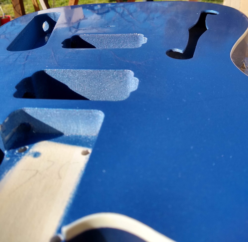 In sunlight there is still some orange peel remnants visible, mainly on the front. But it seems confined to areas that will be under the pickguard so I might leave it alone rather than risk sand-through.