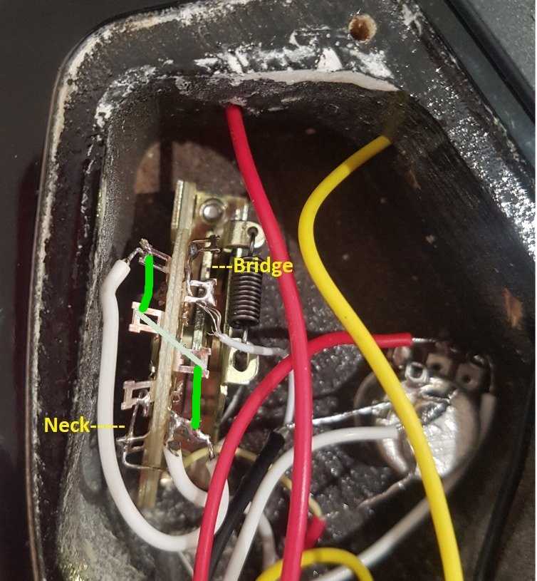 This is the diagram just for the middle switch position, which should select both pickups. The red spots show which terminals on the neck pickup side are connected to each other in that switch position. The neck pickup wire connects to the other red terminal, but that is not connected to the output. It's the same on the bridge pickup side (green spots).