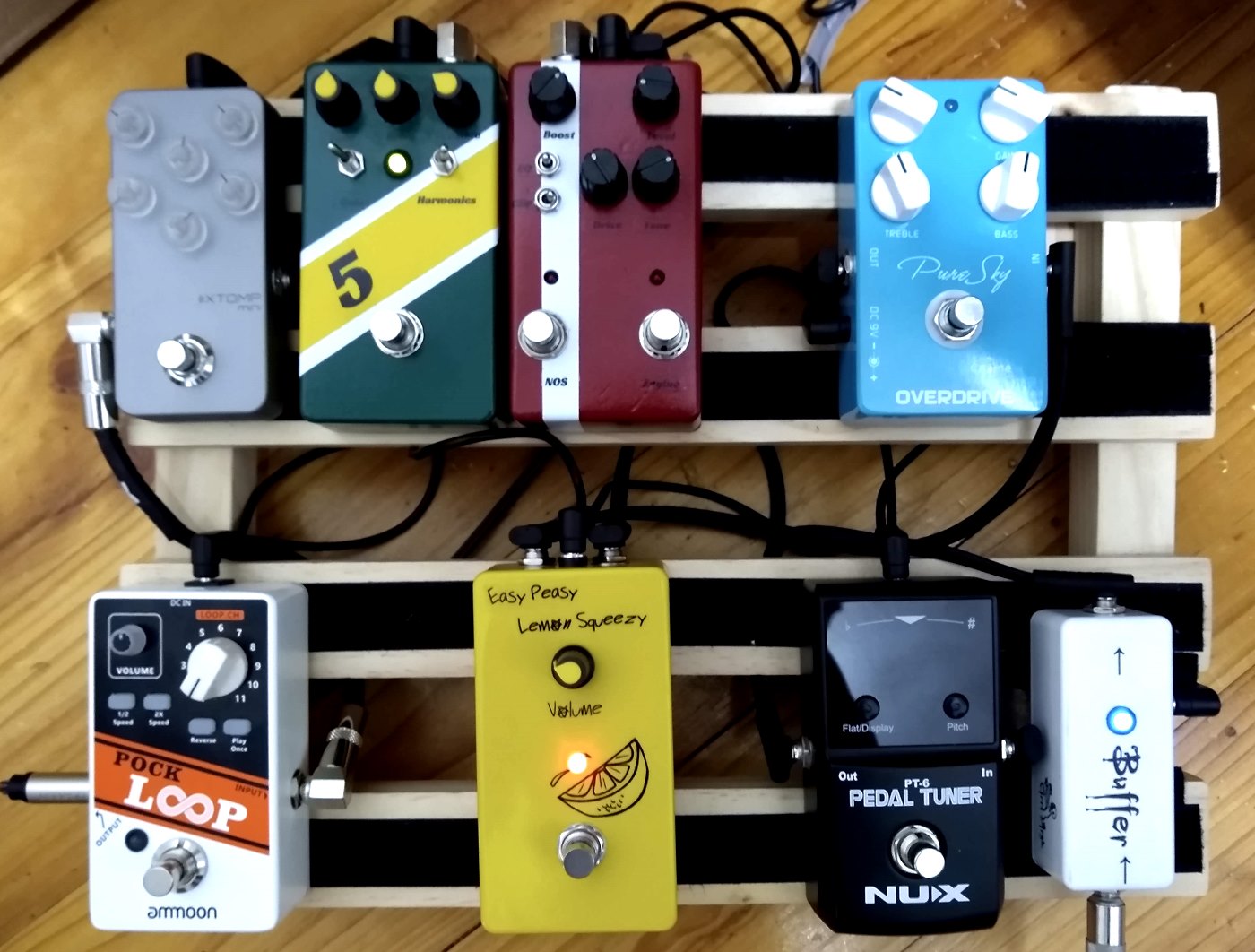 And it's done. I normally run compression after drives, partly on the idea that it preserves the pick sensitivity of the overdrive, but also because I have been using the digital compression built into the THR. Putting the Lemon Squeezy at the front, just after the buffer and tuner. I can use it as a compressor-boost thingy into the overdrives. Or at least that's the plan for now.