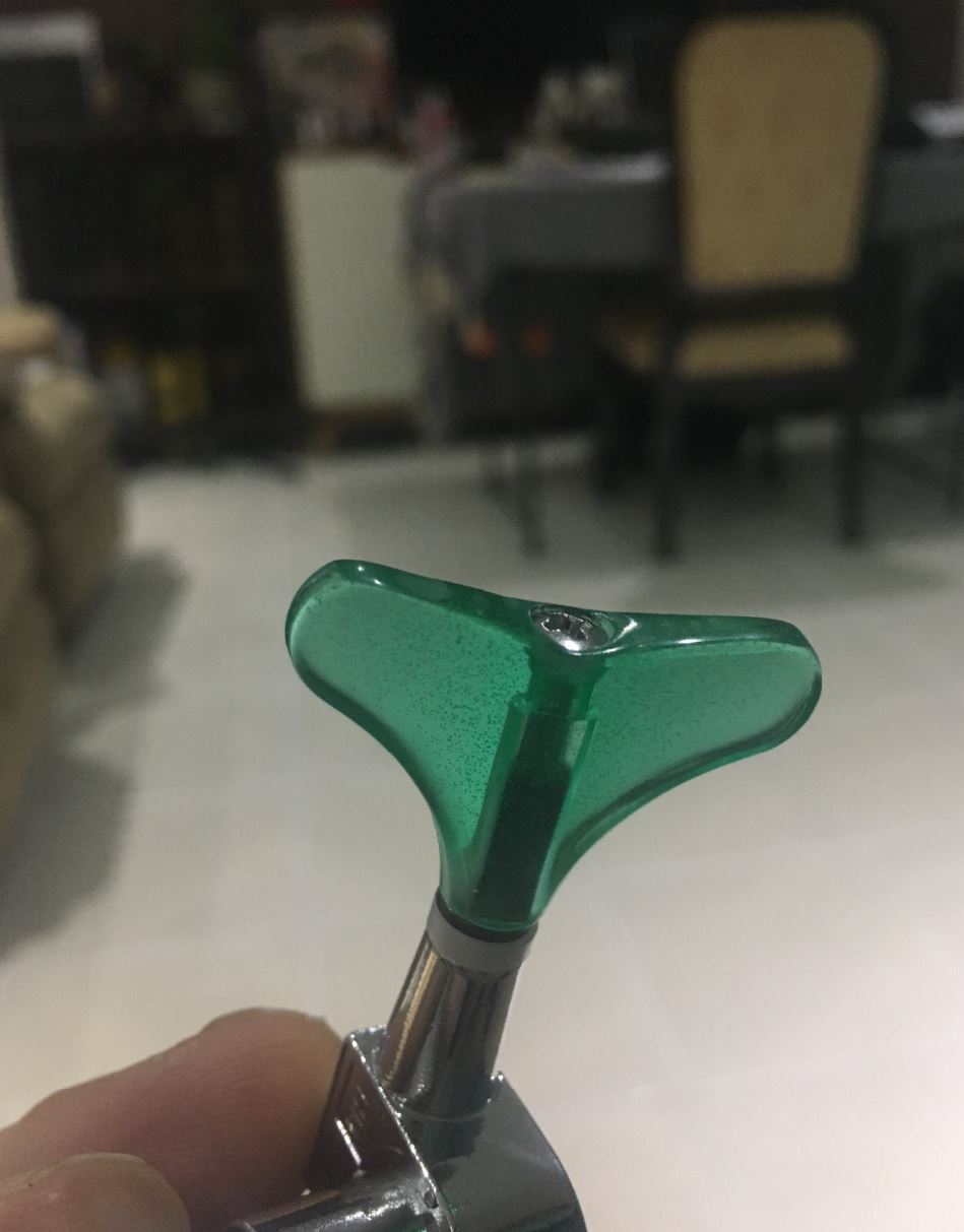 Installing the machine head: I have been waiting in anticipation for this to happen. I am happy with the custom tuning pegs i cast in resin. I threw in a bit of Emerald Green and they came up beautifully. The holes were pre-drilled which made things a little easier.