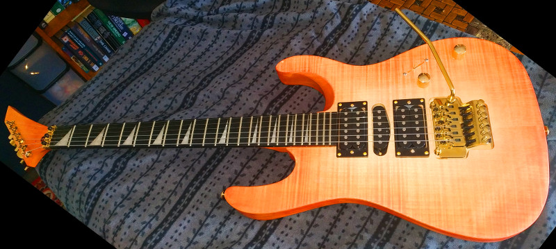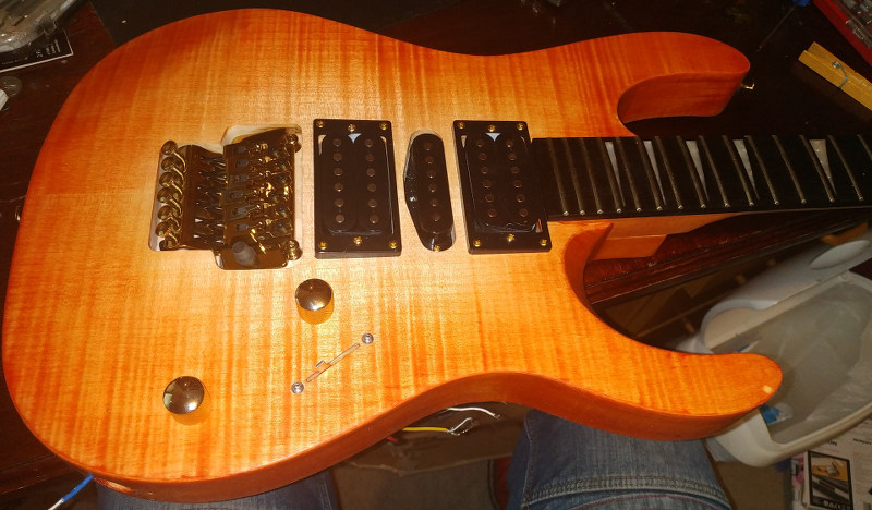 Still waiting for it to dry properly, still slightly tacky. I am putting it outside on the nicer days now summer is on the way. Decided to start throwing the kit on it, and... there is no hole for the trem ground. Time to pull out a drill.