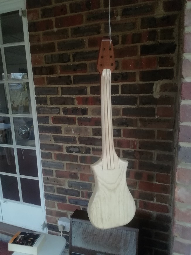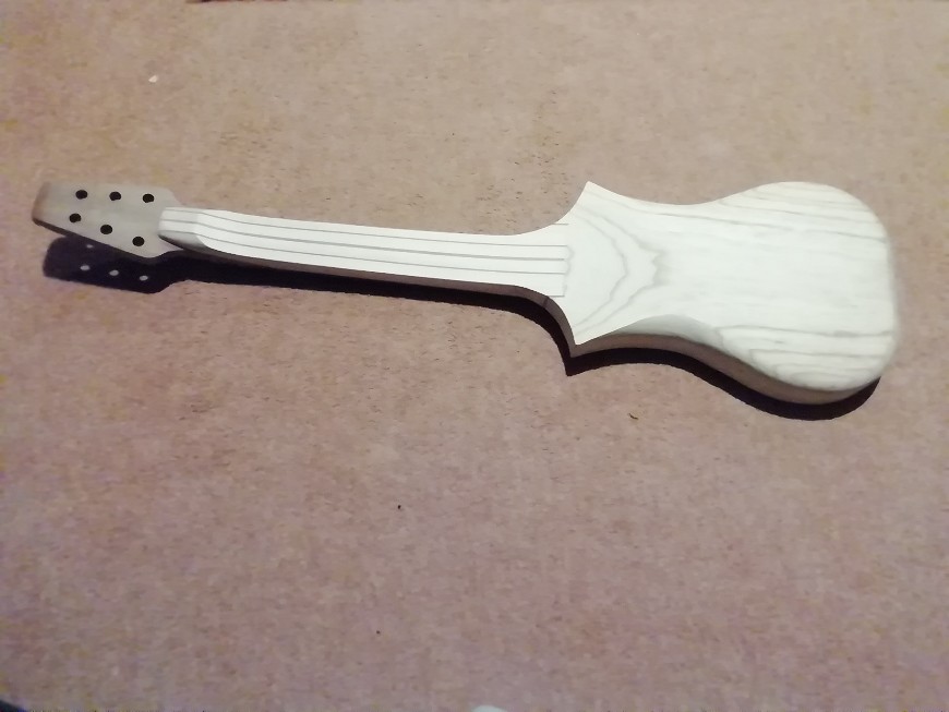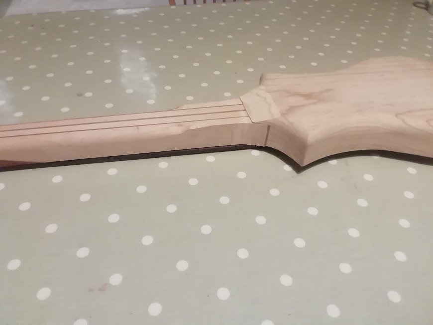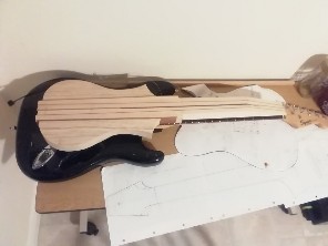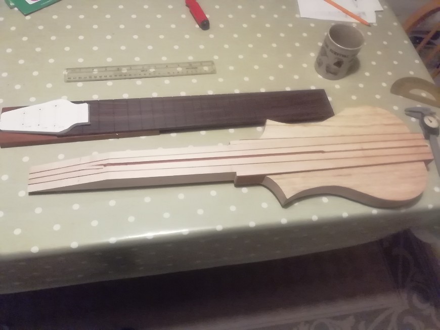 Various components. The headstock shape is an HDPE (=plastic chopping board) template for routing the headstock in place. Plan is to turn it over so both sides are routed with the same cutting errors!