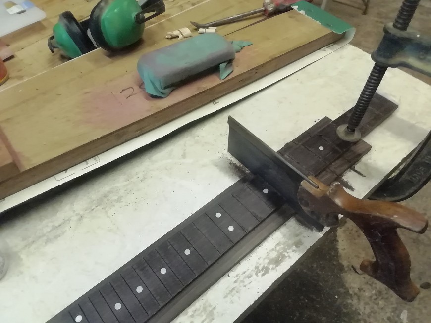 Using a written off Pitbull engineered rosewood fretboard as a template for the fret slots on my new fretboard.