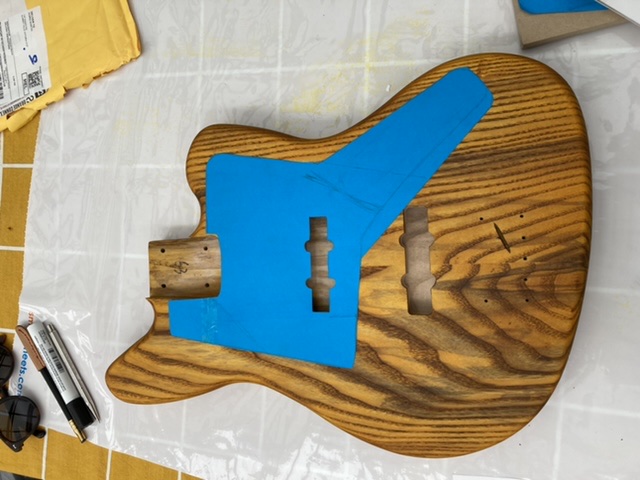 I was chuffed with my baking paper template to get the pick up position. It may have been a terrible idea to cut this out now but we’ll see. There is wiggle room for the guard to get it lined up properly. Measurements were based on both the positions of the bridge pickup and the pickup placement in the original pick guard.