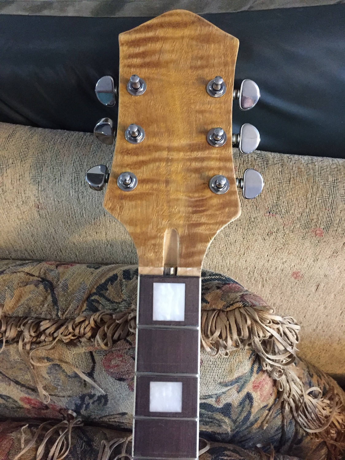 I finished levelling, crowning, and polishing frets, and glued a curly eucalypt veneer onto the headstock, drilled for tuners, and have some old Grovers I was given, to use. I have gone with the "imperfections", and am running with the concept of an "old" new guitar. I'm also using a vintage Gold bigsby B6 , one 1950s Gibson P13 pickup, and some old pots and knobs I have here. The only new parts, (apart from the kit), are a switch, output jack, and one of the pickups, which is a reproduction by Curtis Novak.