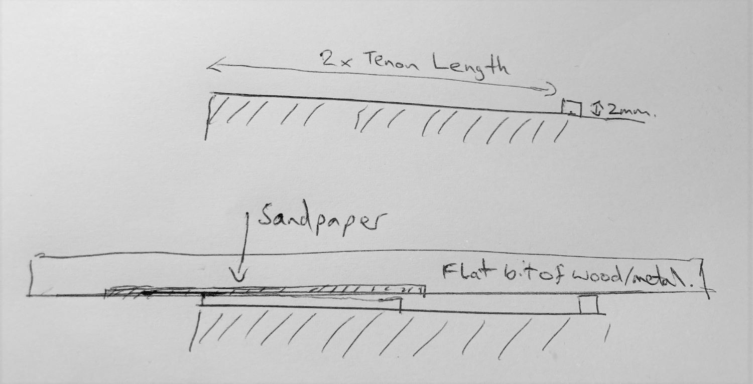 If you want a shim that is 1mm high on one end, then stick a 2mm high block on some wood double the length of the shim away from the edge (block is always 2x the required shim end height).