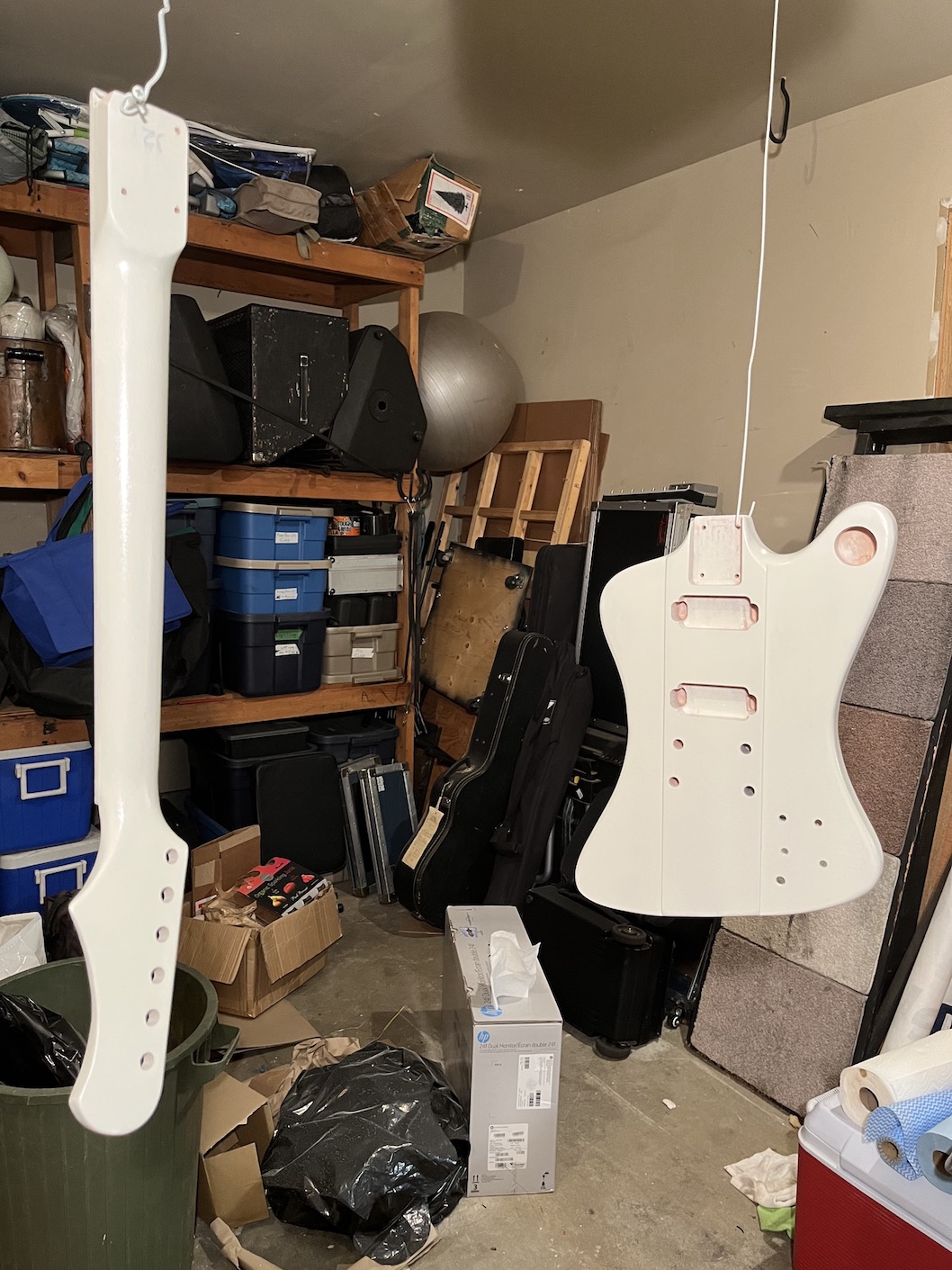 Okay, working WAY too fast. Gig cancelled tonight, a rarity in the Pacific Northwest, but snowed in with another storm on the way - and rain on Saturday... :p The wife is snowed in at the property where her horse is paddocked, so left to my own devices, started assembly on the Flamin' Emu (with the Ronnie Dio audiobook in the background). Some rough assembly... got everything together and strung to tension.