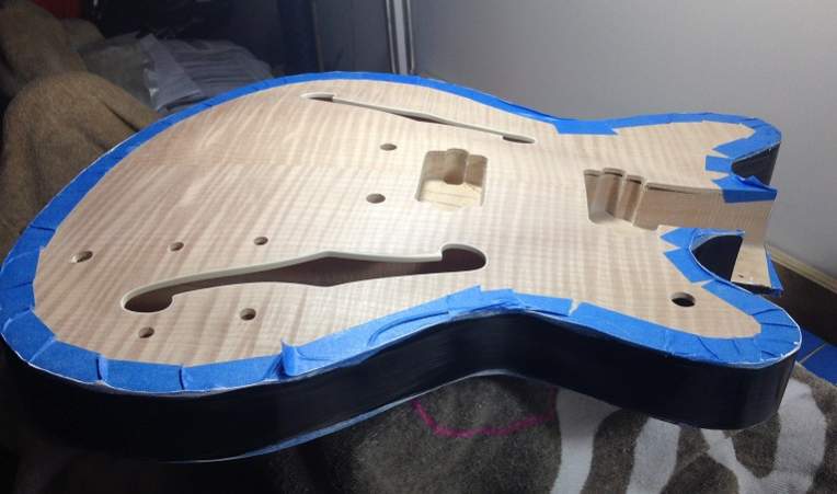 I've sanded gently for 2 weeks, and I've made a decision on finish. I am beginning by finishing the sides of the guitar with a gloss black enamel. The quality of the grain in this area is not good, and I want a visual division between the front and back, both of which will be finished naturally.