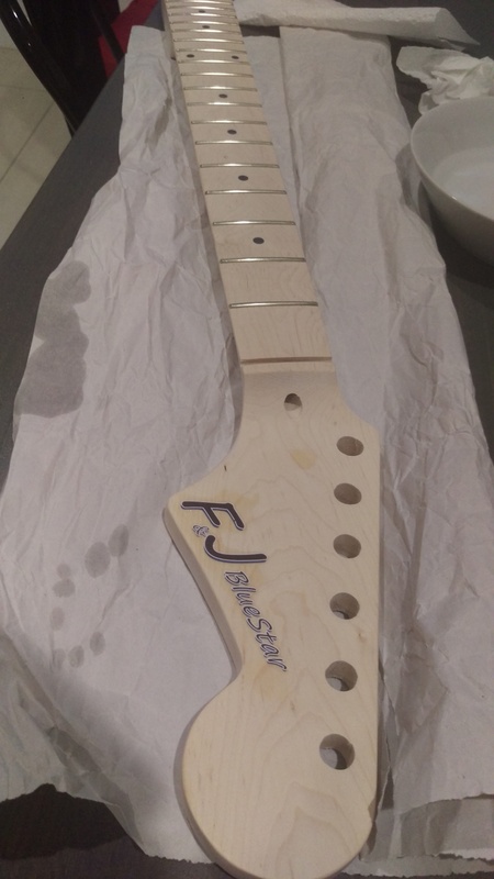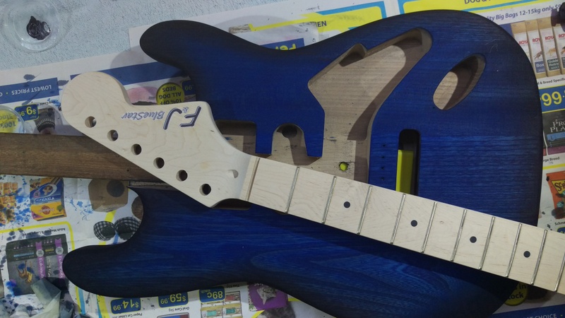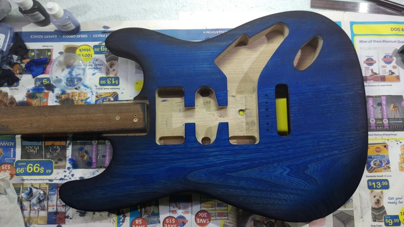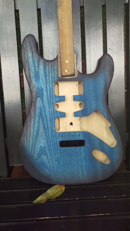 So after more sanding the body was ready to stain: blue and black burst.