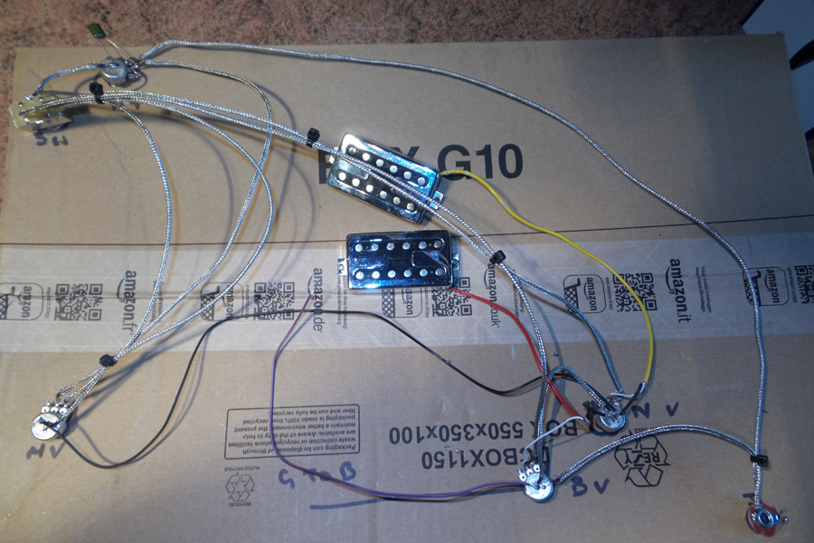 Well did the wiring which was very new to me. but hey, got to learn sometime. Made a mistake of not including the pickups in the template I made. Just assumed the cables would be the right length. So although I did manage to fit the wiring loom into the guitar using the 6mm plastic tubing (Great idea whoever thought of that one), I have had to remove it in order to lengthen the pickup wires.