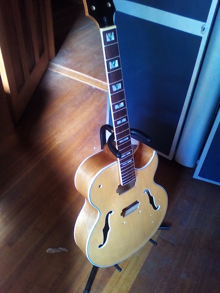 Several clear coats of Aussie Oil rubbed onto top. Walnut stain back and sides. Headstock face painted black.