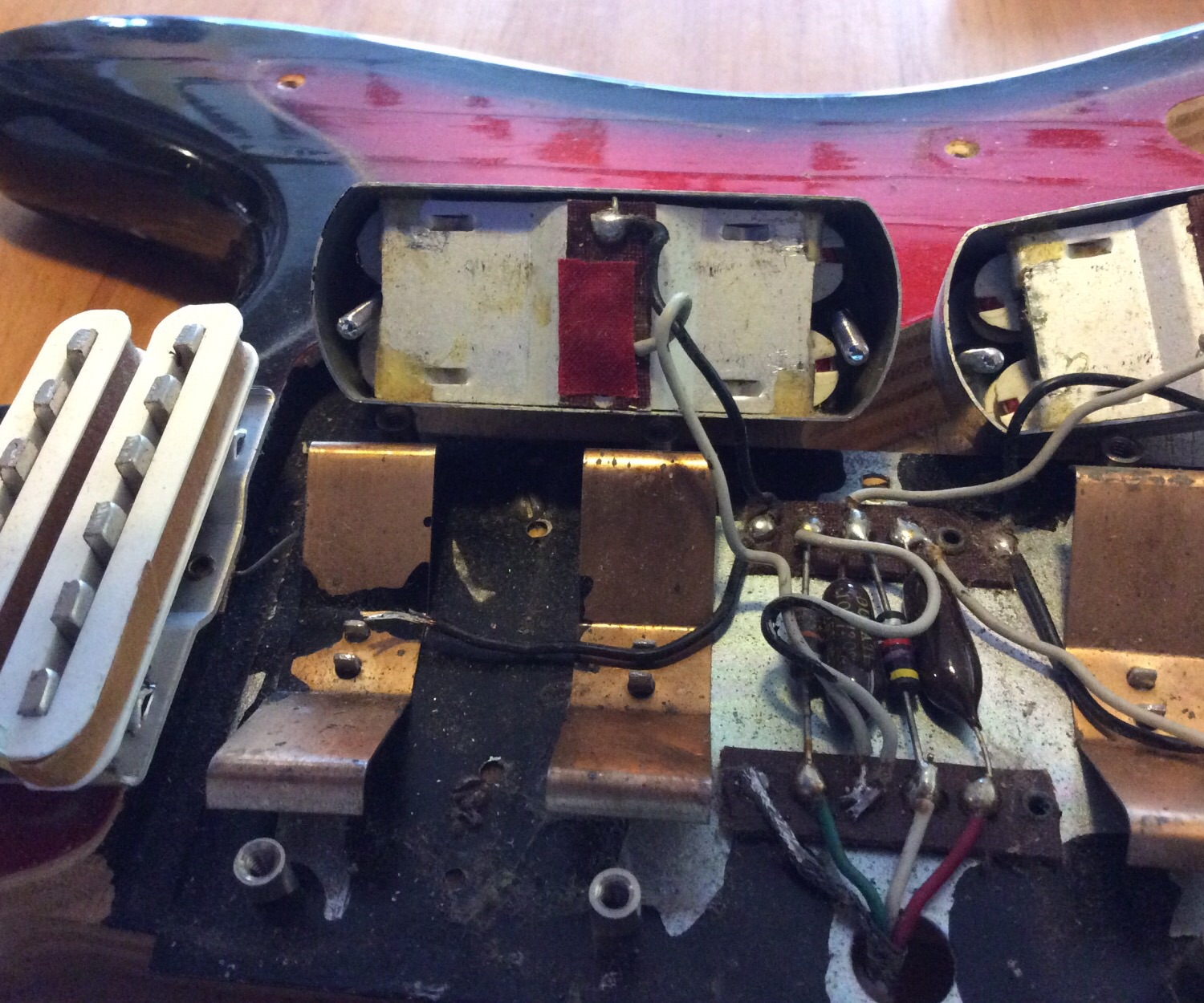 Other fixes: I've soldered the two outside pickups back on, the neck binding is curing, and I've stopped the volume knob spinning on the shaft.
