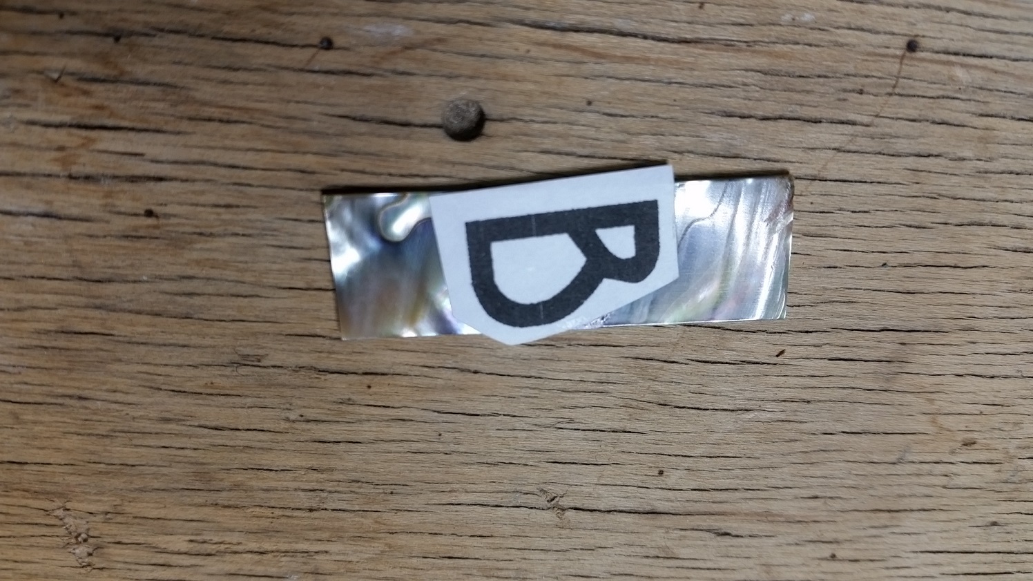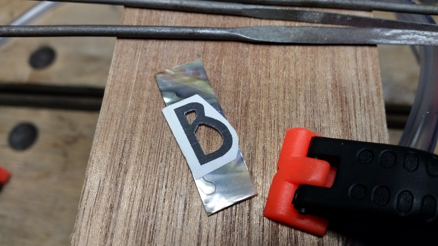 Started by printing out the letter and glueing with pva to a piece of abalone shell. Drilled some pilot holes and used a jewellers saw to cut out the inside edges.