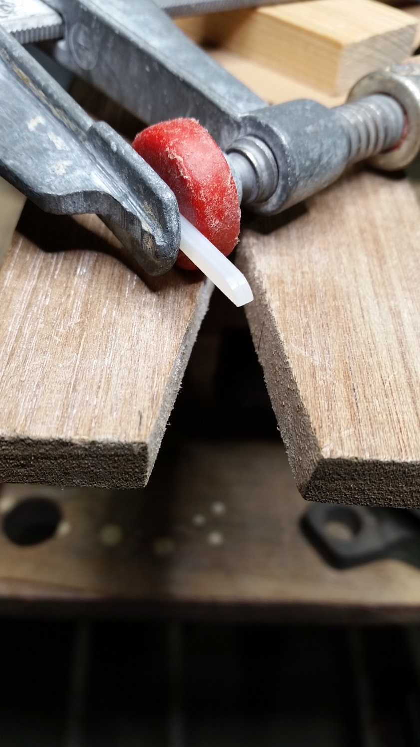 Next were three pieces of white MOP, the centre section is slightly wider than the outer two. To make sure the curves on the bottom end of the outer pieces were the same, clamped them together and filed and sanded them as one.