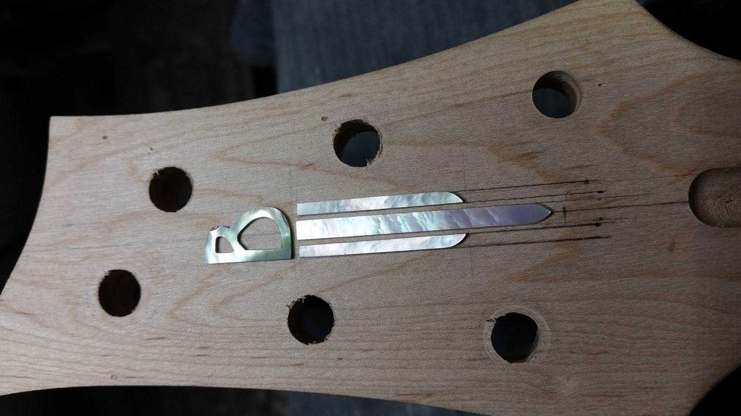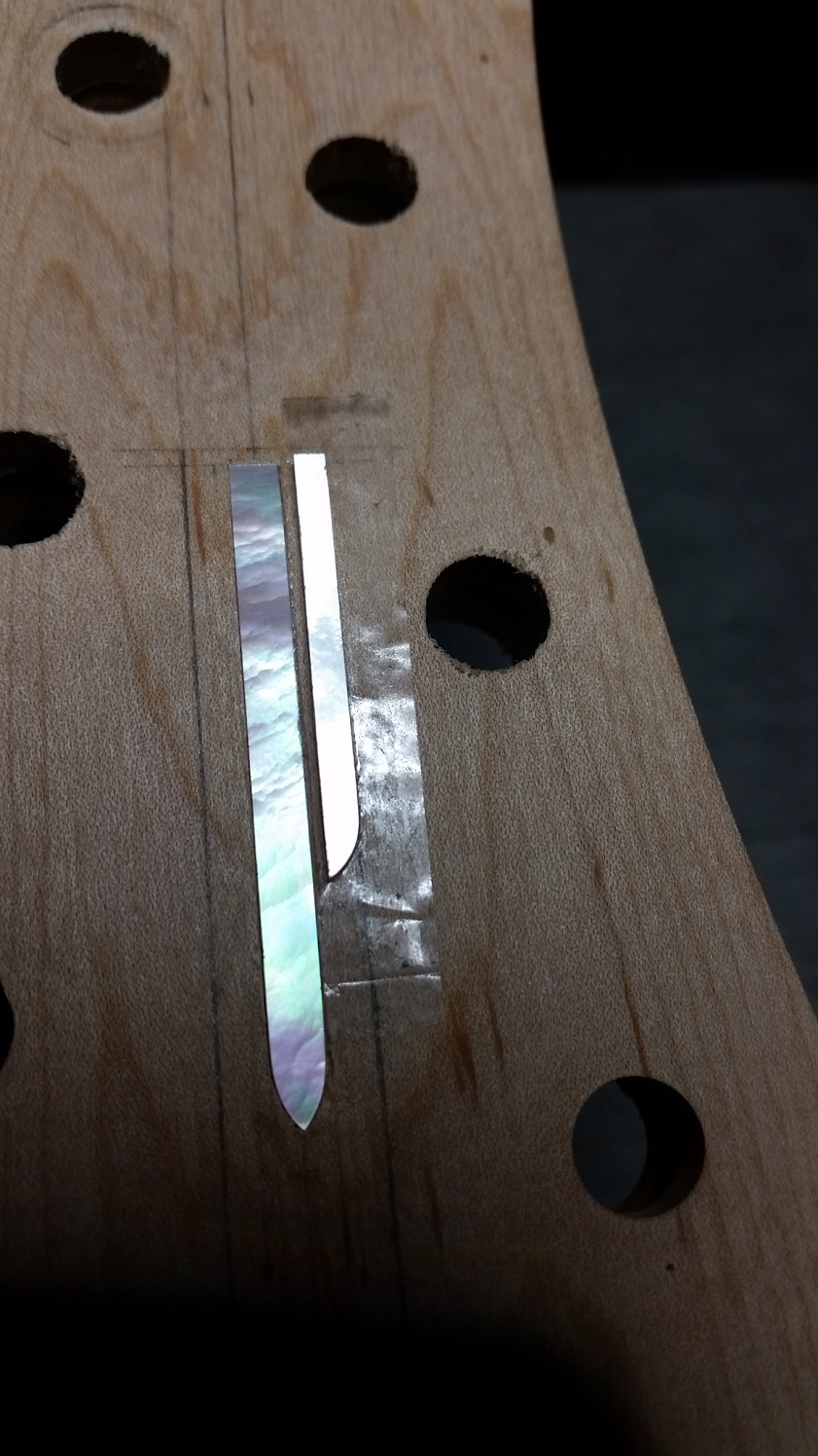Got a 2mm chisel from Carbatec to cut the recesses for the inlay and followed the 'cut to cut' method of using a scalpel to mark the outline of each piece and then the chisel to cut the rebate (the shell pieces are about 1mm thick). Held the individual bits in place using clear double sided tape. Also this was the perfect time to use the articulated magnifying lamp to see what I was doing (got that from Jaycar, comes in handy when doing wiring as well).