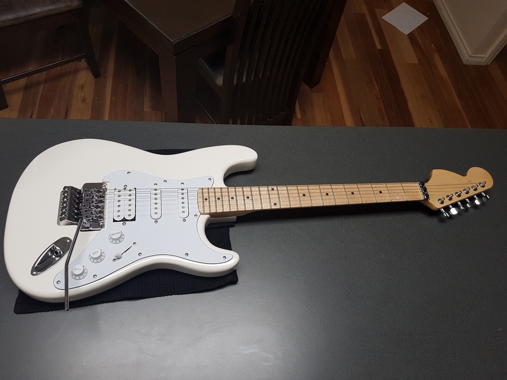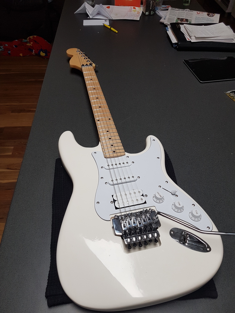 After letting the paint settle for a few weeks I wet sanded and then cut and polished and its finally done!! Here are some pics and I will put up a video so you can hear what it sounds like. Everything is as it came from Pitbull,Im really happy with how it feels, plays and sounds and for a 1st build.Attachment 17308Attachment 17309Attachment 17310Attachment 17311Attachment 17312