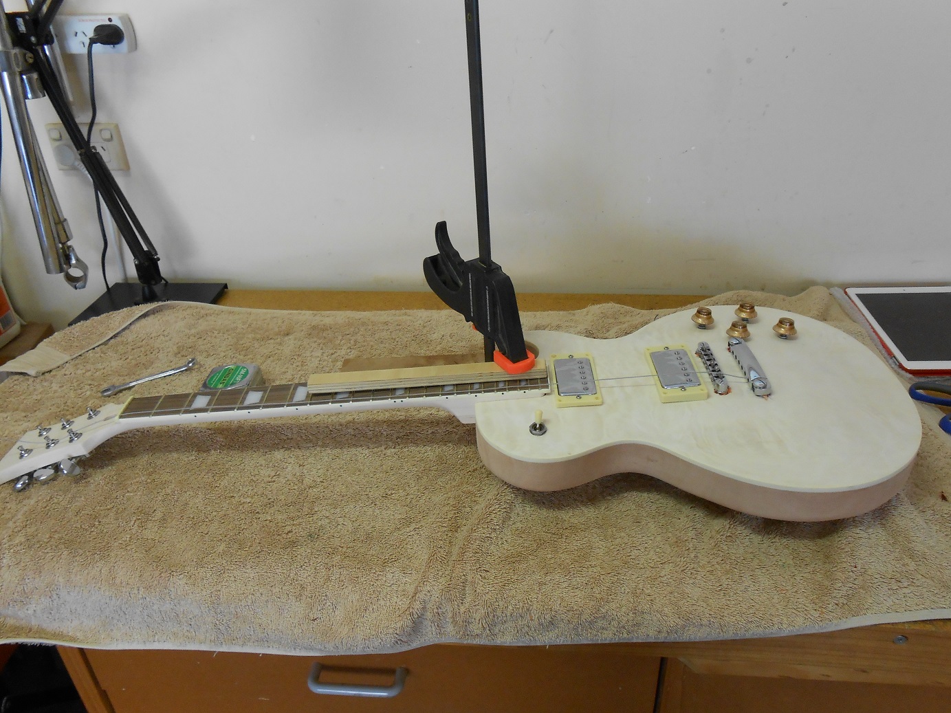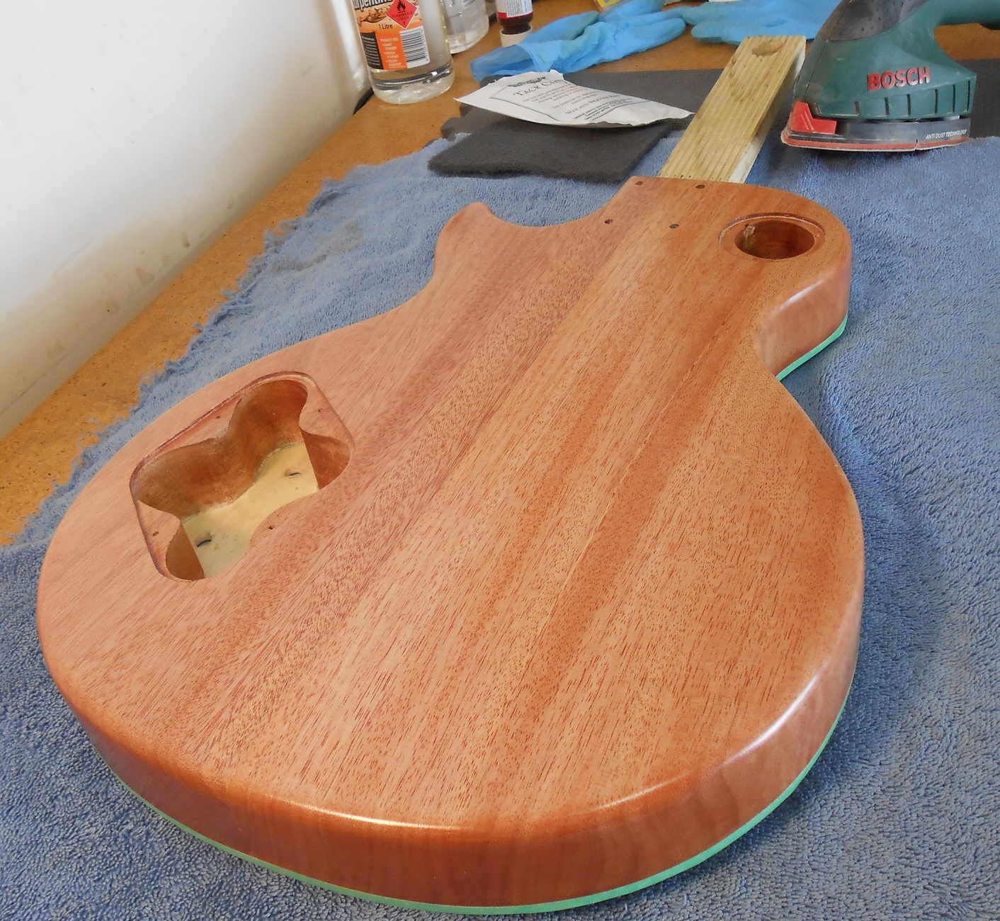 The neck I am not going to color just finish with TO. Well... I am a bit open to suggestion here as I could fill it with mahogany TM or even a light mahogany stain to match the body to give it a bit of colour. It wouldn't take much TM as there is little open grain in the maple neck. There is some nice colouring in the maple which is why I am tending to just TO. I will stain the topside of the headstock the same at the guitar top.