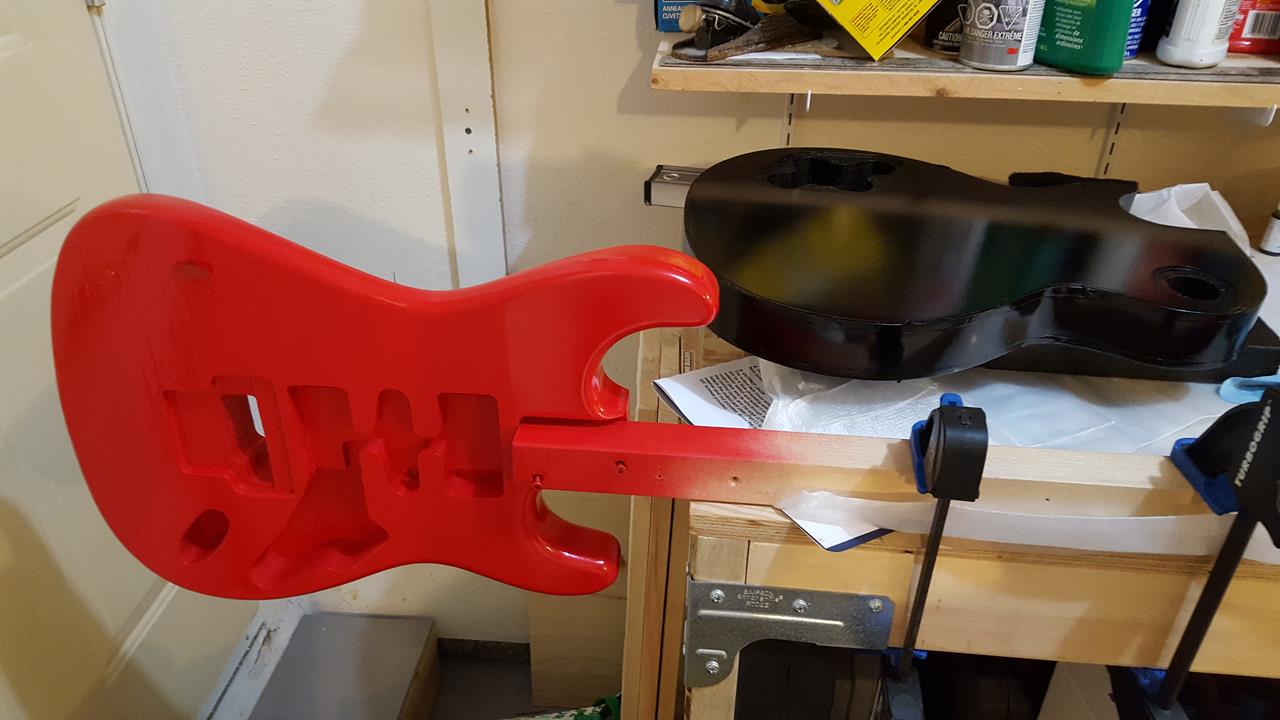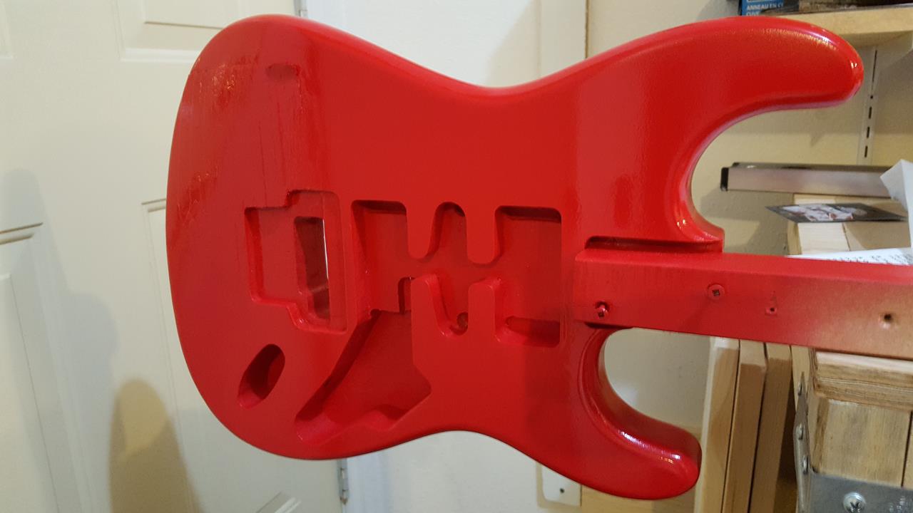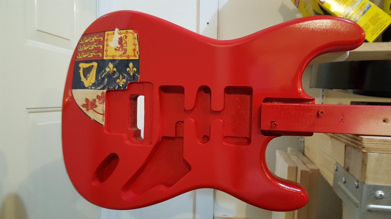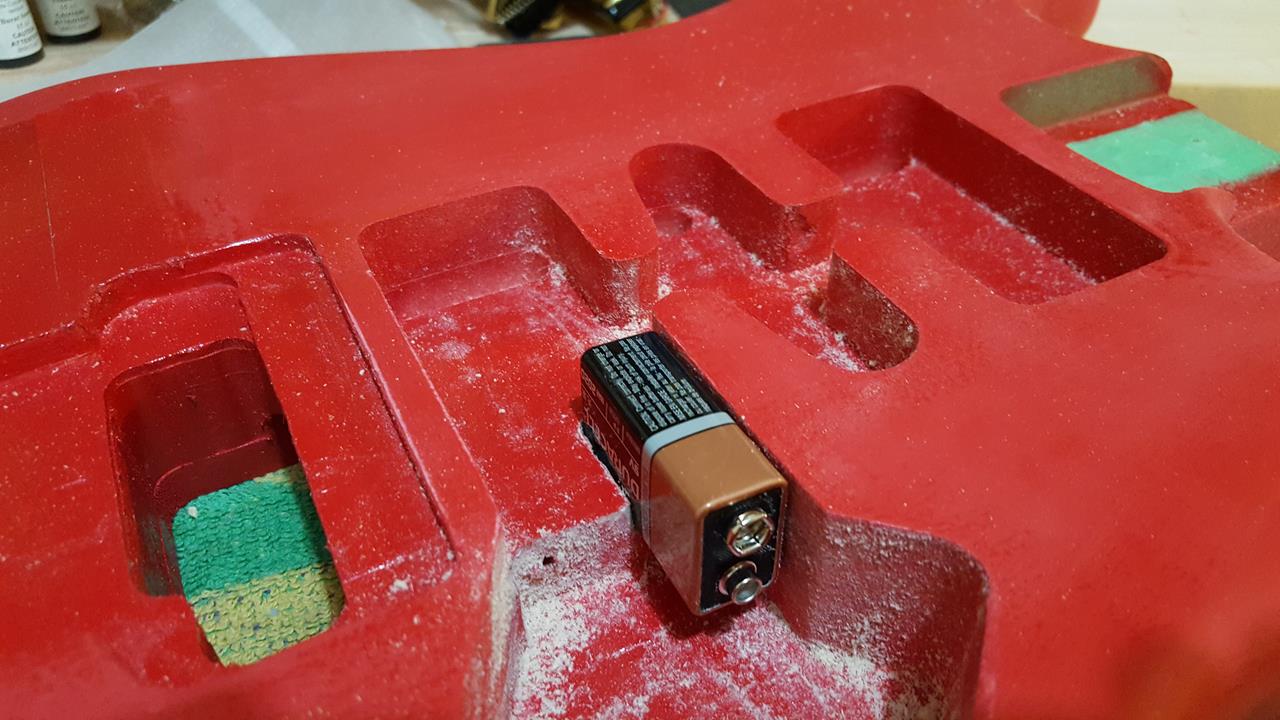 Winter has finally ended in Canada so I can get on to finishing this off. Before I completed the colour coats I realized I should find a spot for the battery to go. It was able to tuck nicely beside the bridge pickup after some Dremel work.