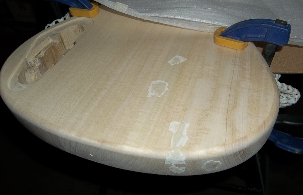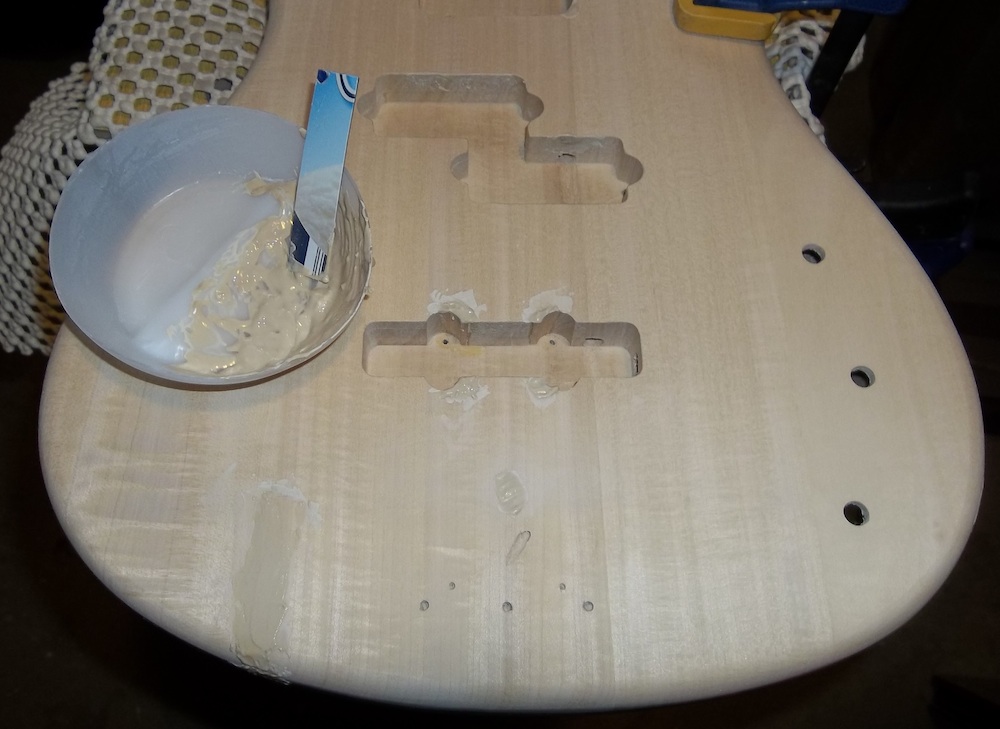 Time for some timbermate touch-ups. For this build I decided not to grain fill all over, but instead just fill any questionable areas like the old ground wire hole plug, bridge pup lugs, the body seam and tearing on the back of the body.