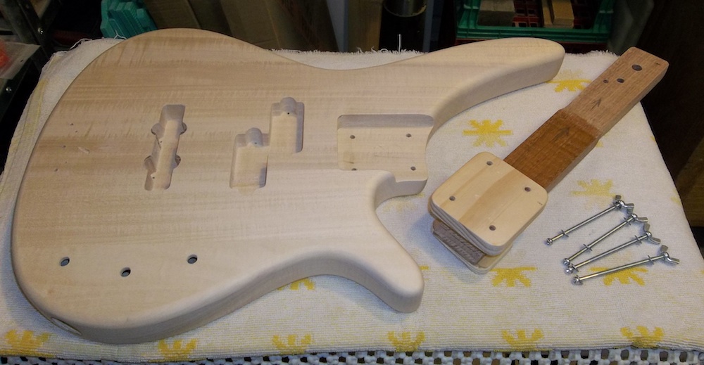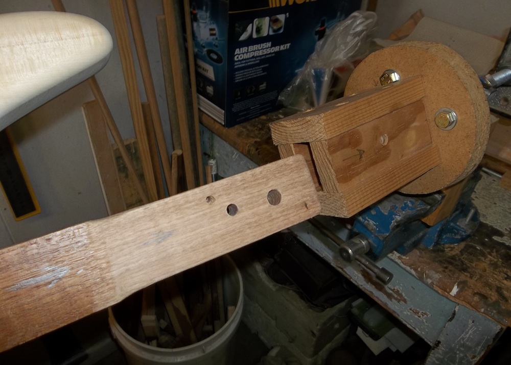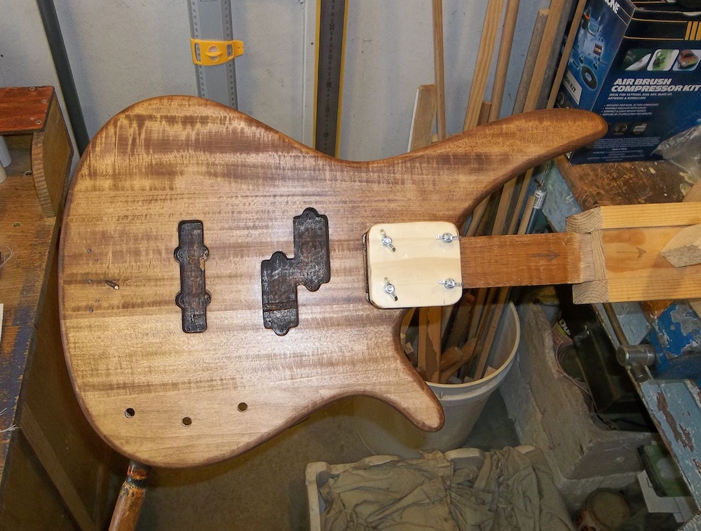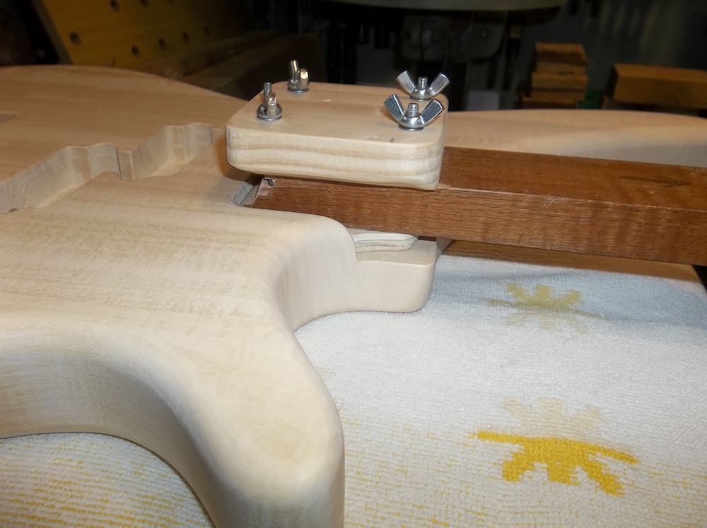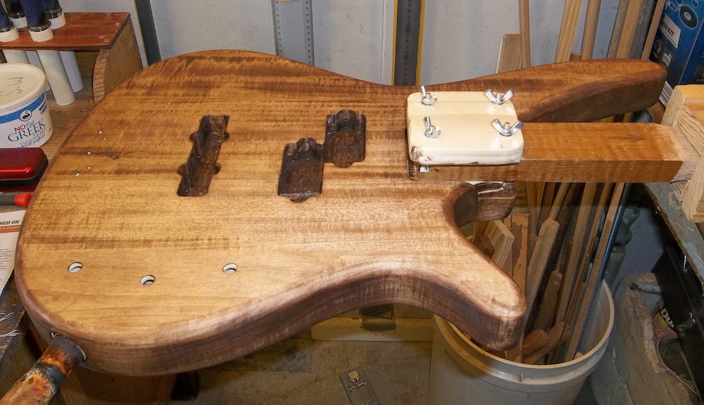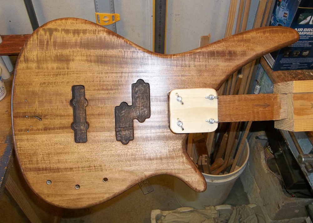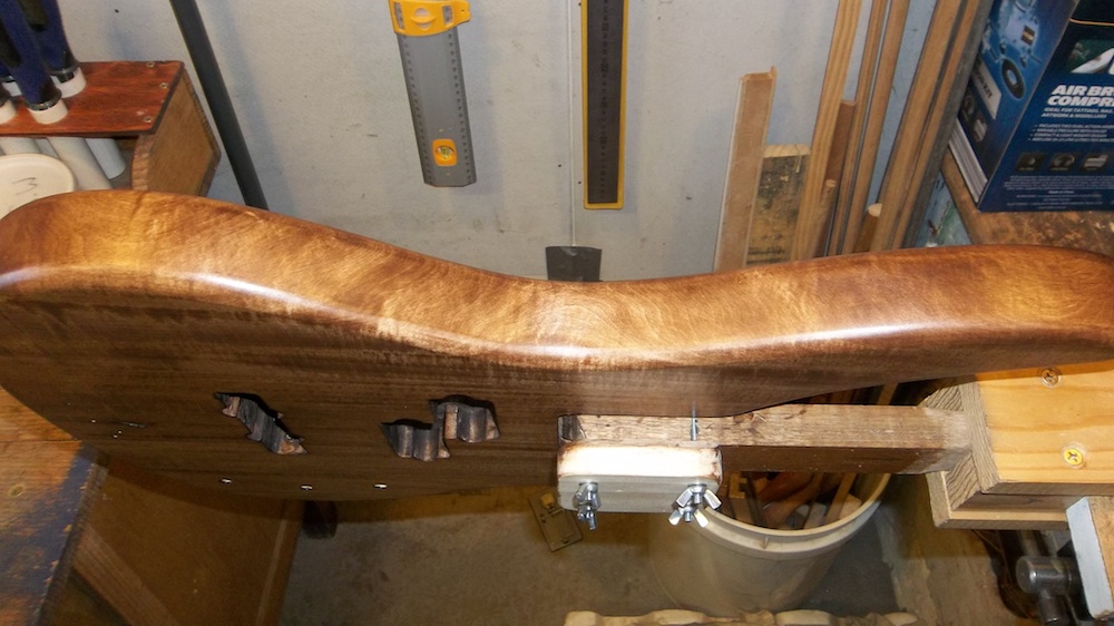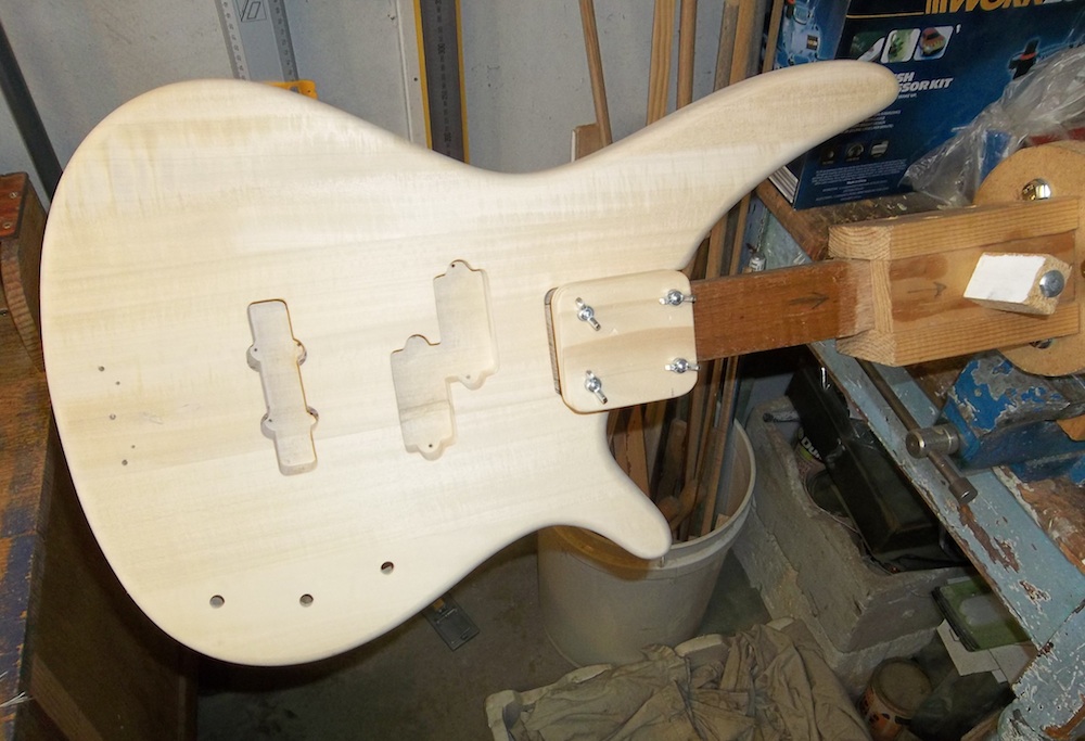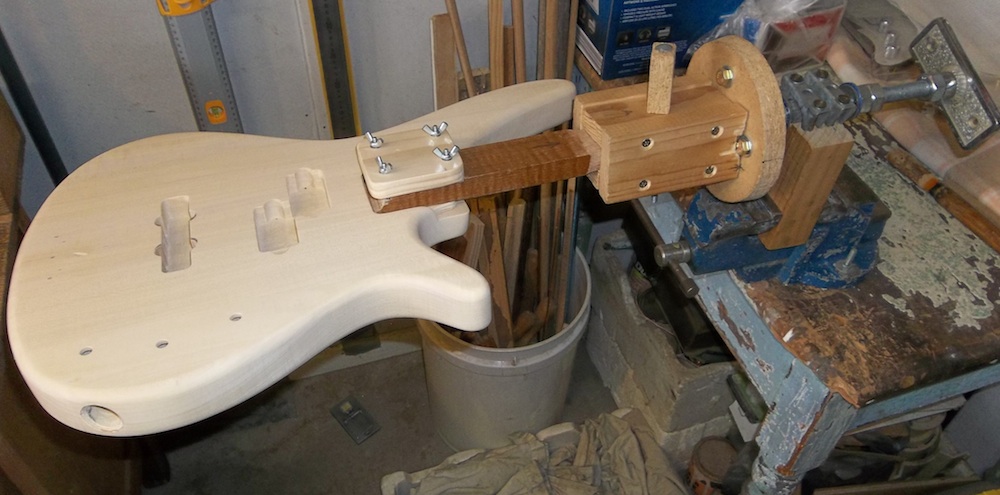 Body is fully prepped and ready for some colour, so it's time to set it up for the painting rig. Basically, an arm/shaft that is bolted into the neck pocket while allowing full access around the pocket.