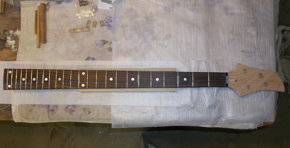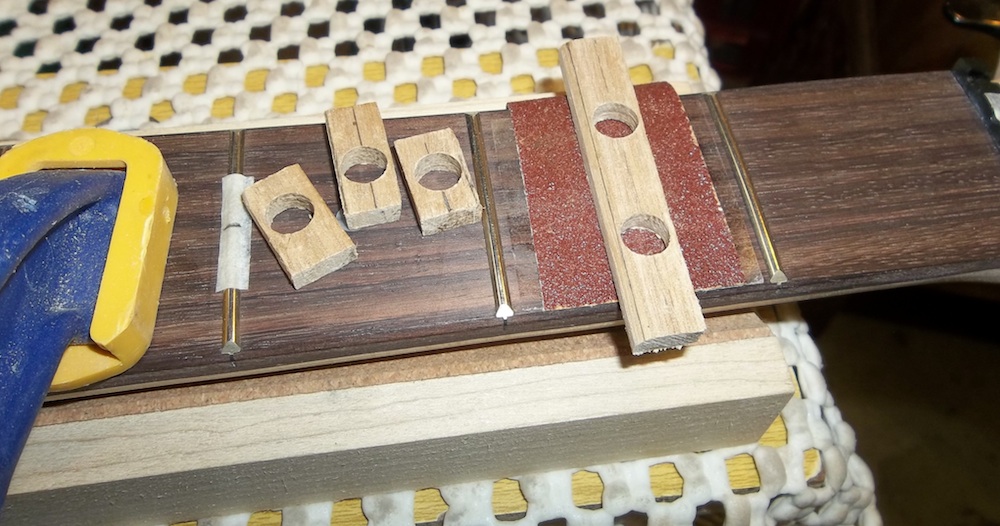 Final cleanup of the new dots and then a scrape and fine sand of the fretboard up to 1500 grit.