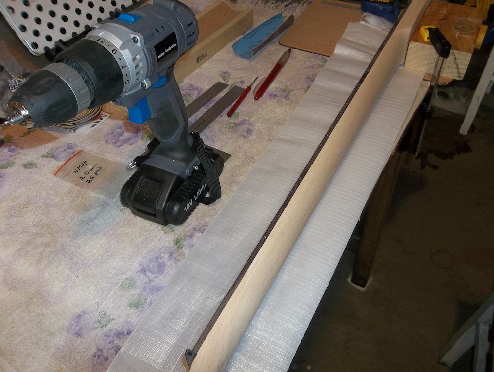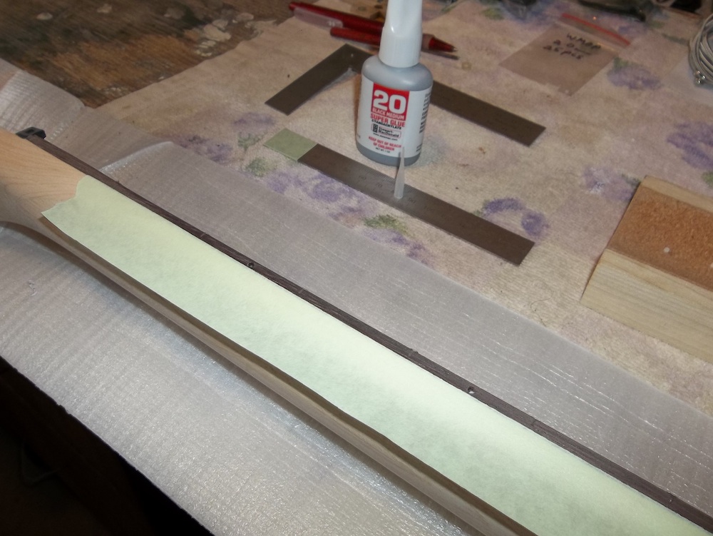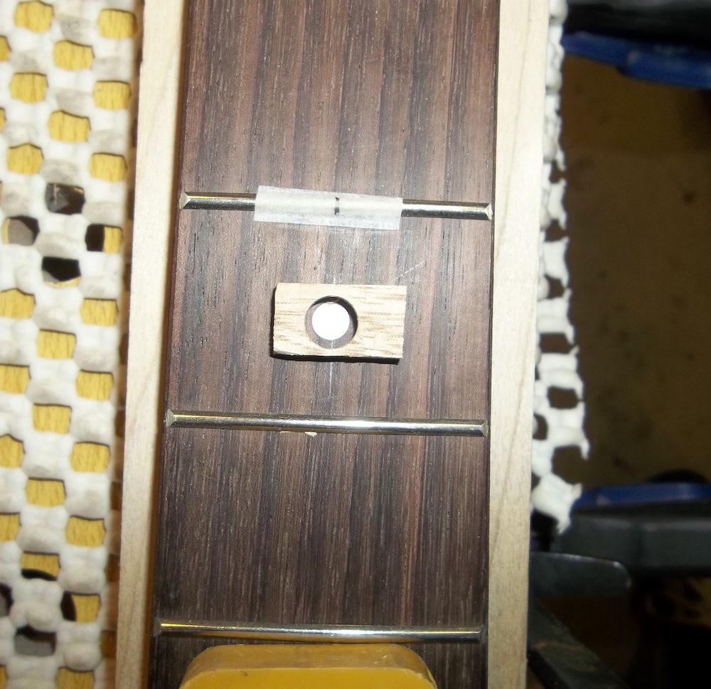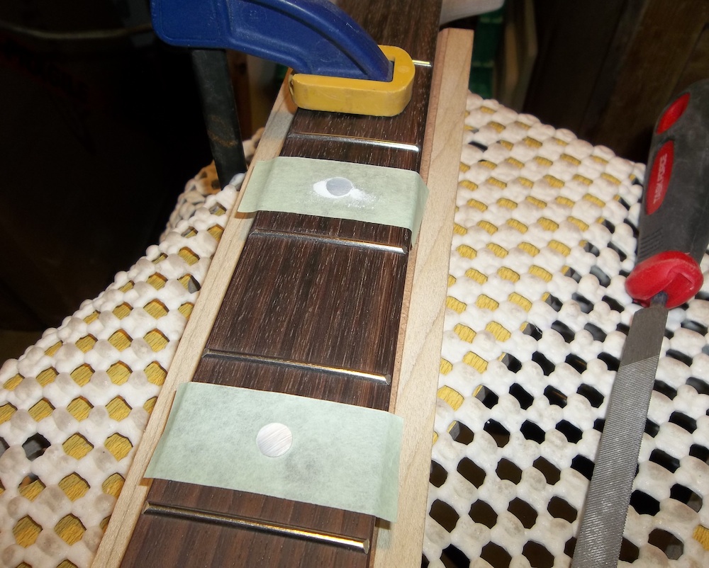 Time to finish up the fat dots. Some lengths of masking tape stacked on top of each other and then drilled through with a sharp 8mm brad point to act as guards for the fretboard so that I could use a file to rough down the radius on the dots.