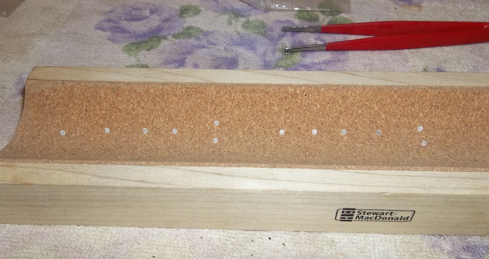 I had some 8mm white MOP dots that I would be unlikely to ever use on a guitar, so I figured a 24 fret bass would probably be my best chance. Why not. I thought I'd be happy enough just trusting in the position of the existing 6mm dots and just drill the new dots holes directly over them. As such, I drilled some small guides and radiused them to match the fretboard.