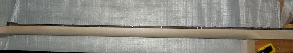 If I'm replacing the fretboard dots I may as well do the side dots with white MOP too. I had to fudge the position of the new dot holes in a couple of places, otherwise they wouldn't have covered the old plastic dots which weren't always in the right spot.