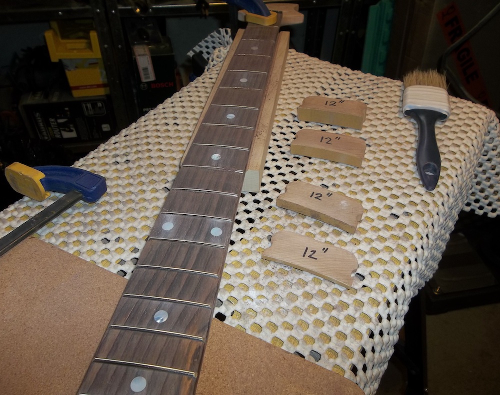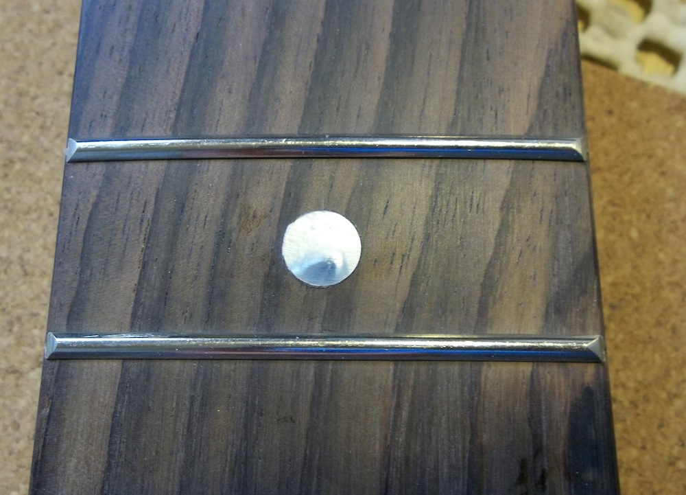 The initial radiusing revealed a flaw on the 15th fret dot that was previously hidden. My first reaction was to drill it out and replace but the shape grew on me so I decided to leave it.