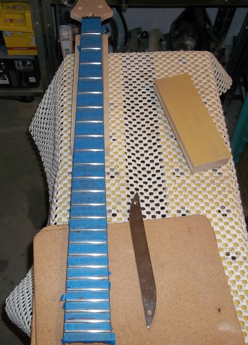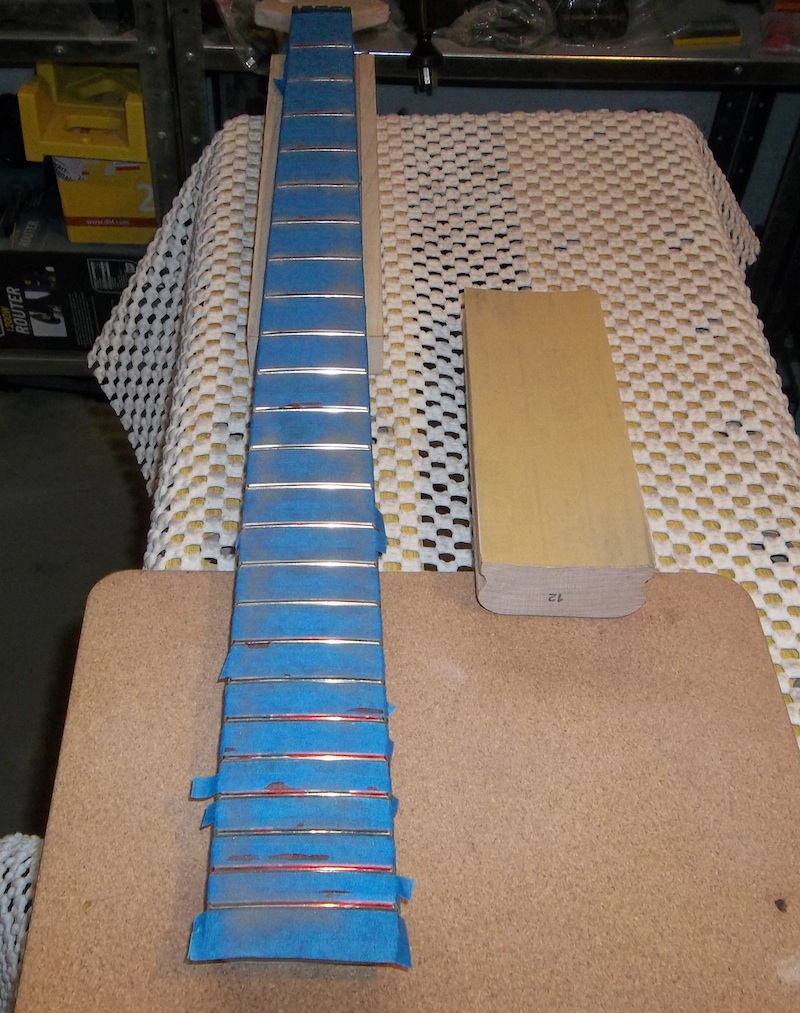 I seated a few frets, touched up the ends, and then it was time to level. Fret rocker to find the high points, marked with black, and then everything else gets red.