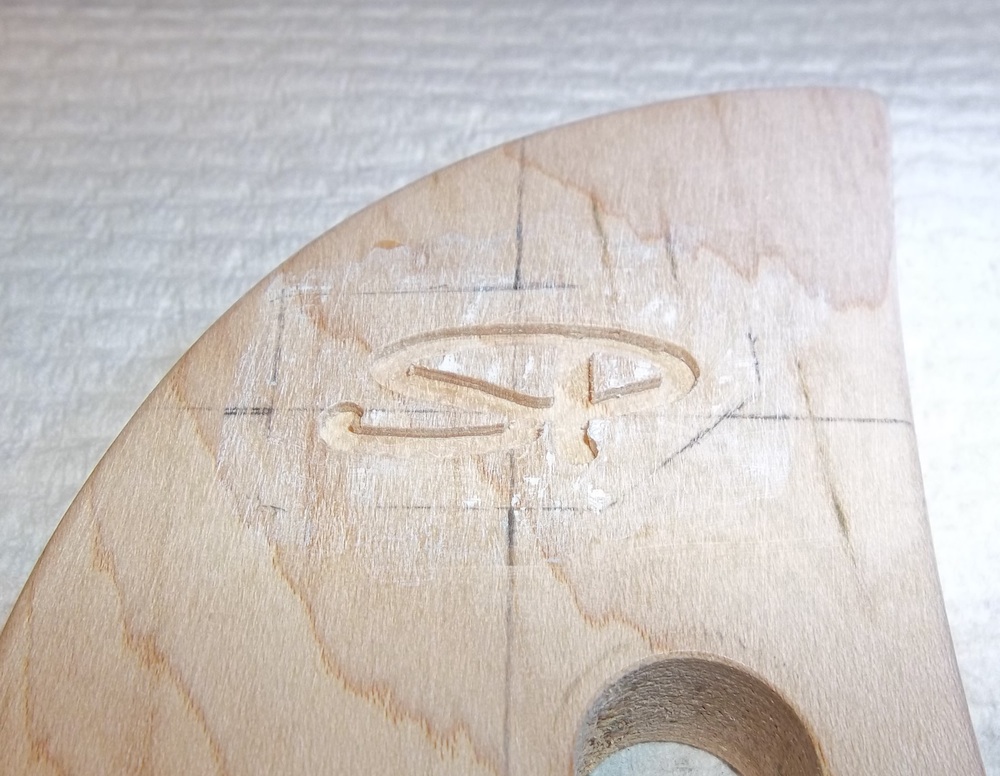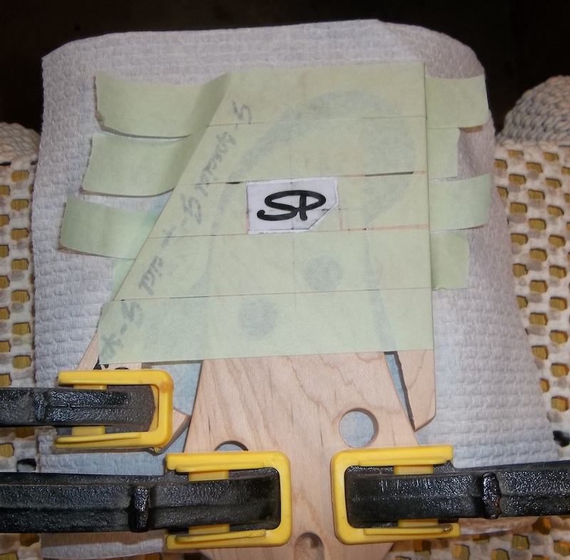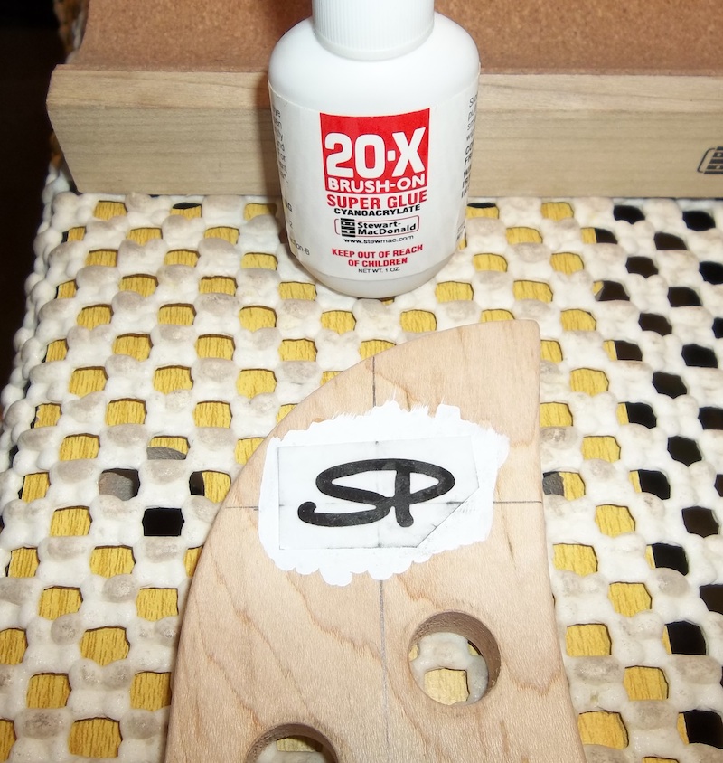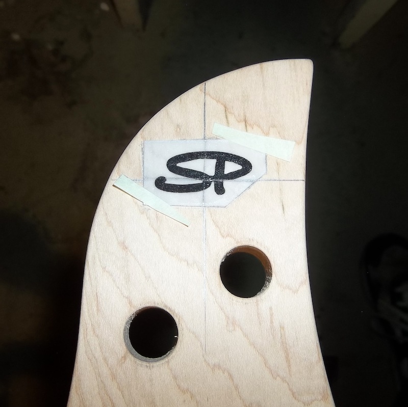 Tape up the area with some extra wood to provide a more stable base. The tape protects the headstock and also matches the level of the taped up area with the height pattern and liquid paper.