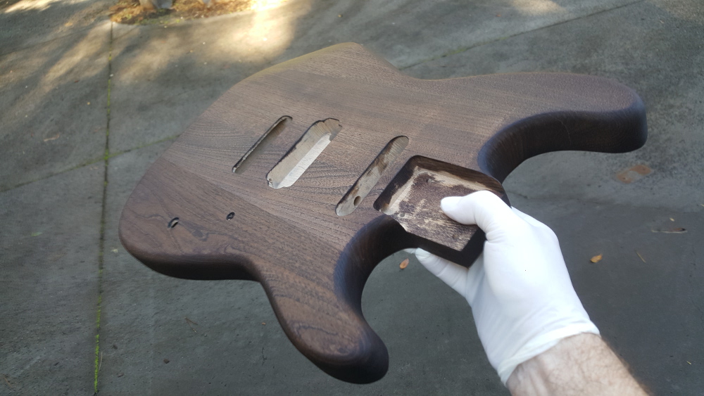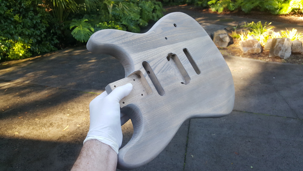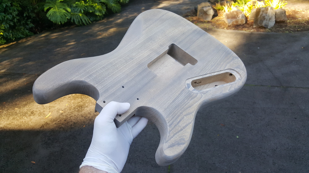 I finally got some time to progress this beast today. The ebony Timbermate is sanded it off with 400 grit, and the body is now smooth as a baby's wossname. It might be even too smooth. We'll see!