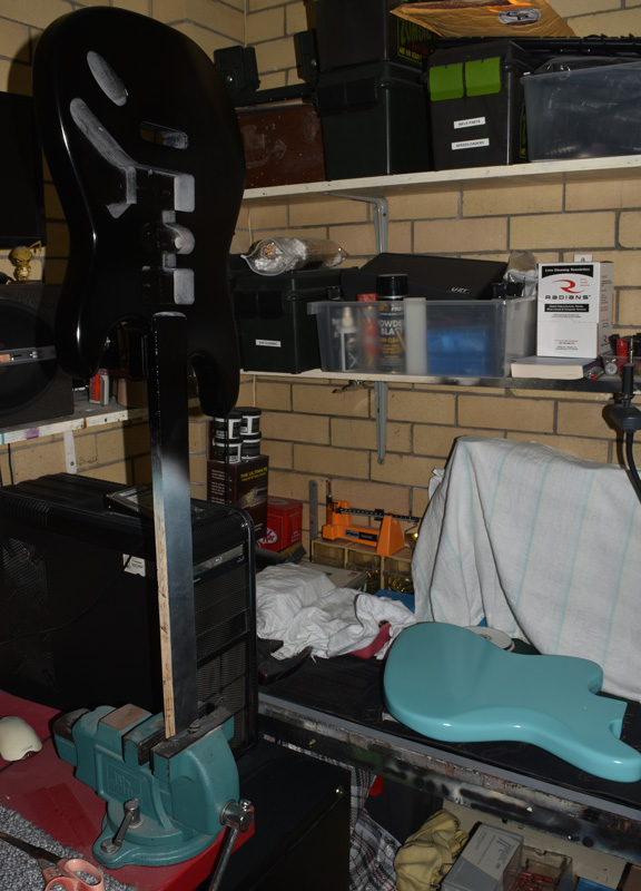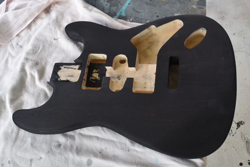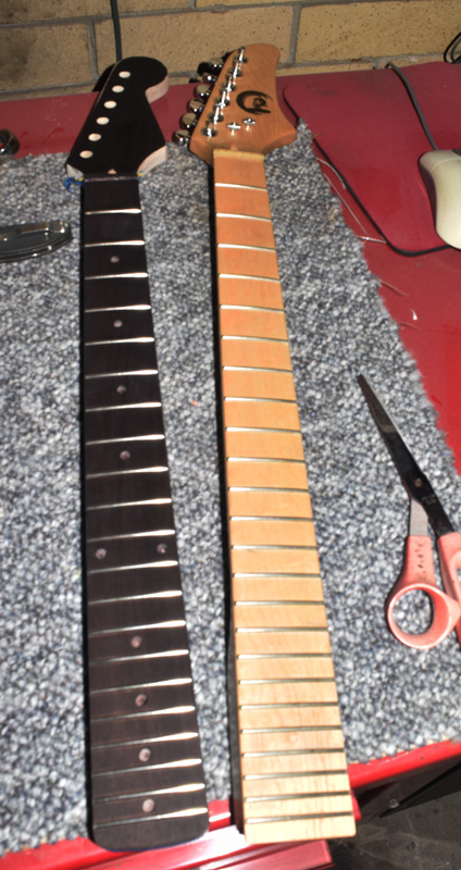 nek minnit Strat neck: dyed a bit darker, headstock cut to shape, front face stained black, fret board dots removed, nut removed.