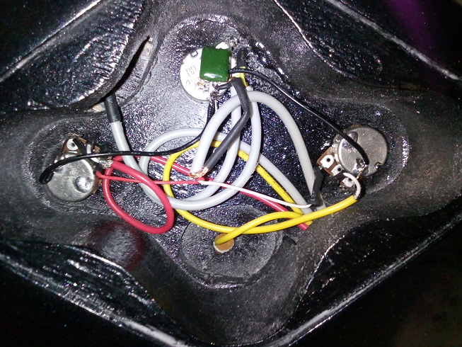 Here are a couple of shots of the wiring I used screened cables throughout. The 3rd volume pot (middle pickup) not installed yet. I ran a stereo screen up to the switch for front and back pickups and then a single core screen back to the tone control then out to the jack. I will tie wrap them neatly when the 3rd pot is installed.