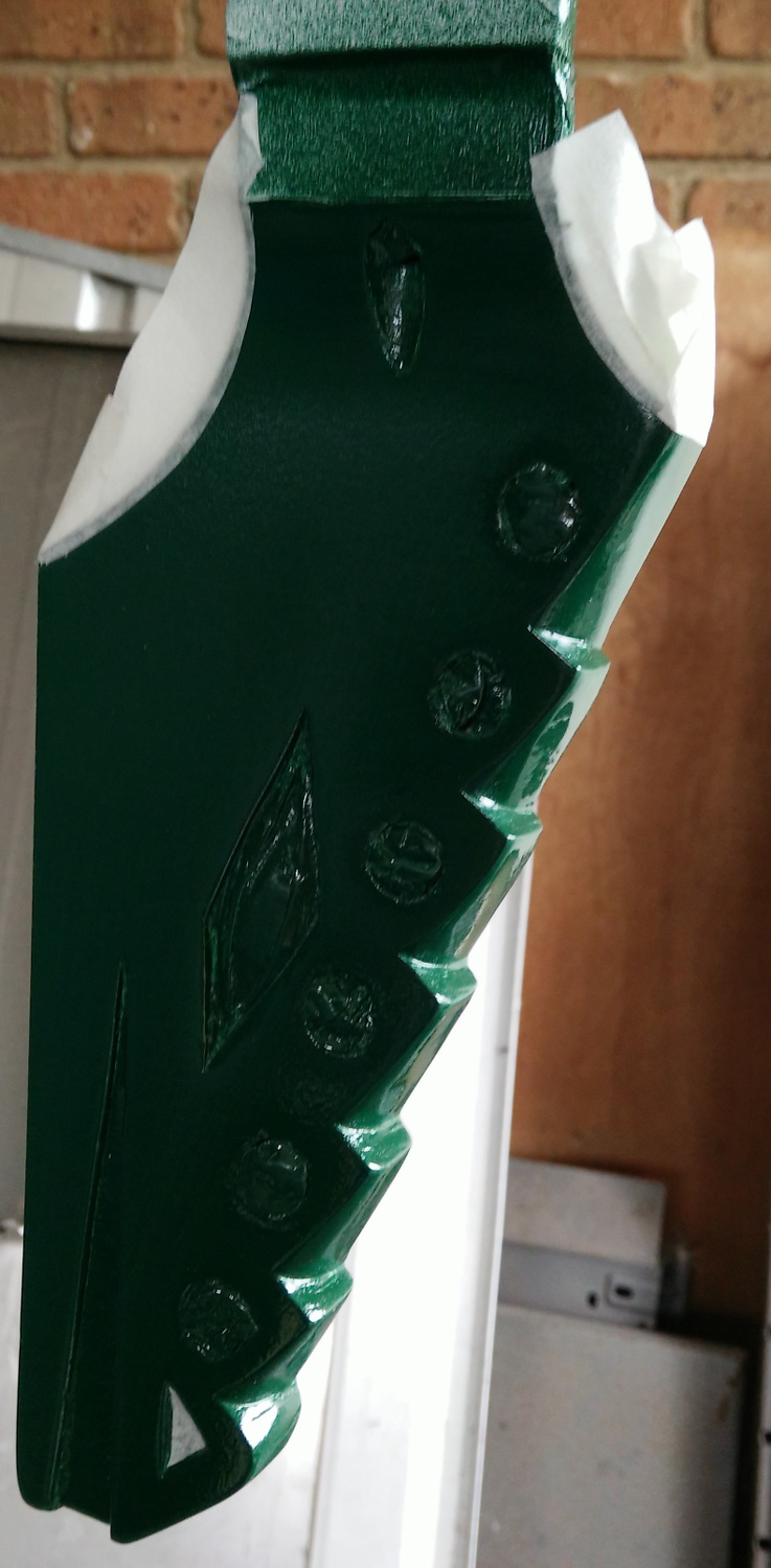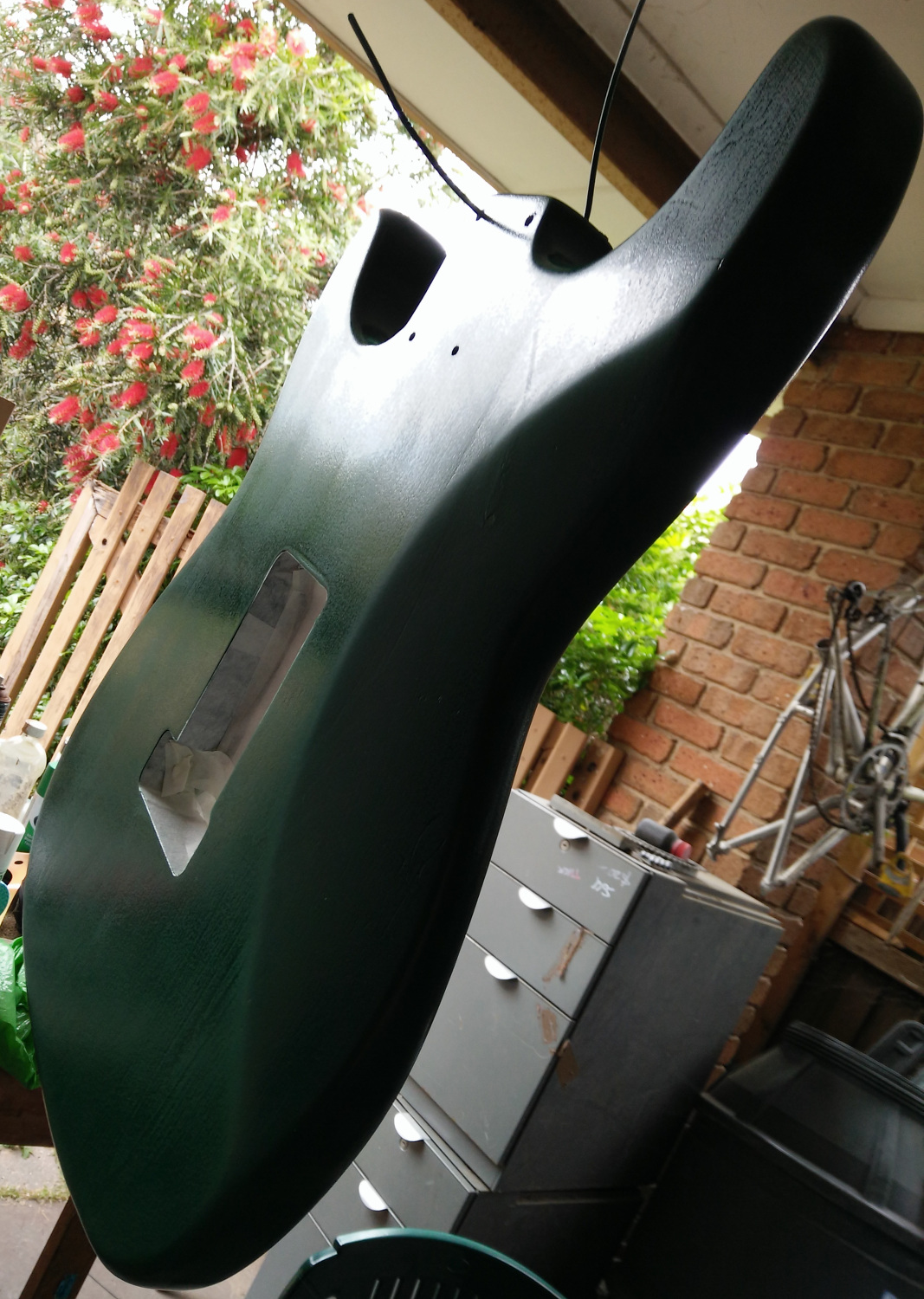 Final masking, and went to spray glitter, but the test paints seem to have left glitter in the can's seal, and I got a lovely splatter effect on the headstock... a quick trip to bunnings for a new can, and I've finished the glitter layer.