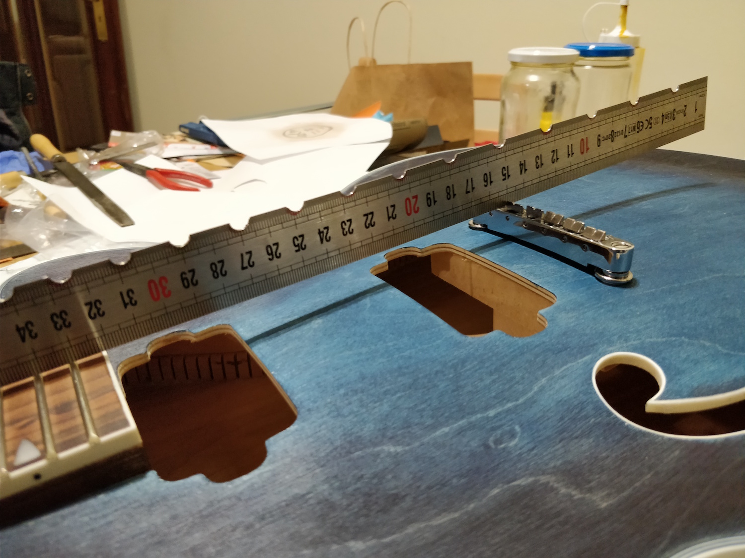 I'll try to do it, although it means that I have to screw the bigsby like bridge to the body so I can give some tension to the strings. I was hoping I would only have to do that after clear coating the guitar...