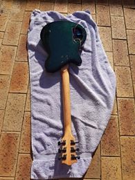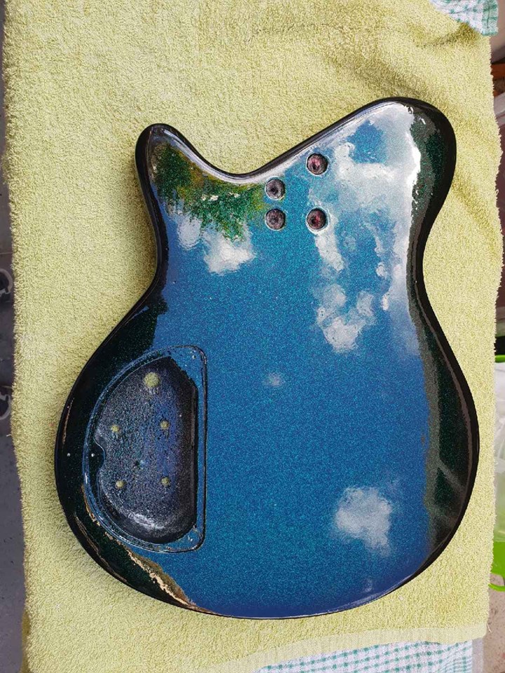 So once again.. problem after problem... we tried to clear coat the guitar after my mate did his amazing art work and of course.. the clear coat reacted with the previous stain that I did and it bubbled and destroyed half of it... so he re painted it and tried to clear again and bam... bubbled and ruined again... After sanding back to wood AGAIN and re painting it... We finally have some success on getting some clear coats on! Here is a few snippets of how it is coming out so far! Image on the front, green flake on the back. Very slowly we are getting there!