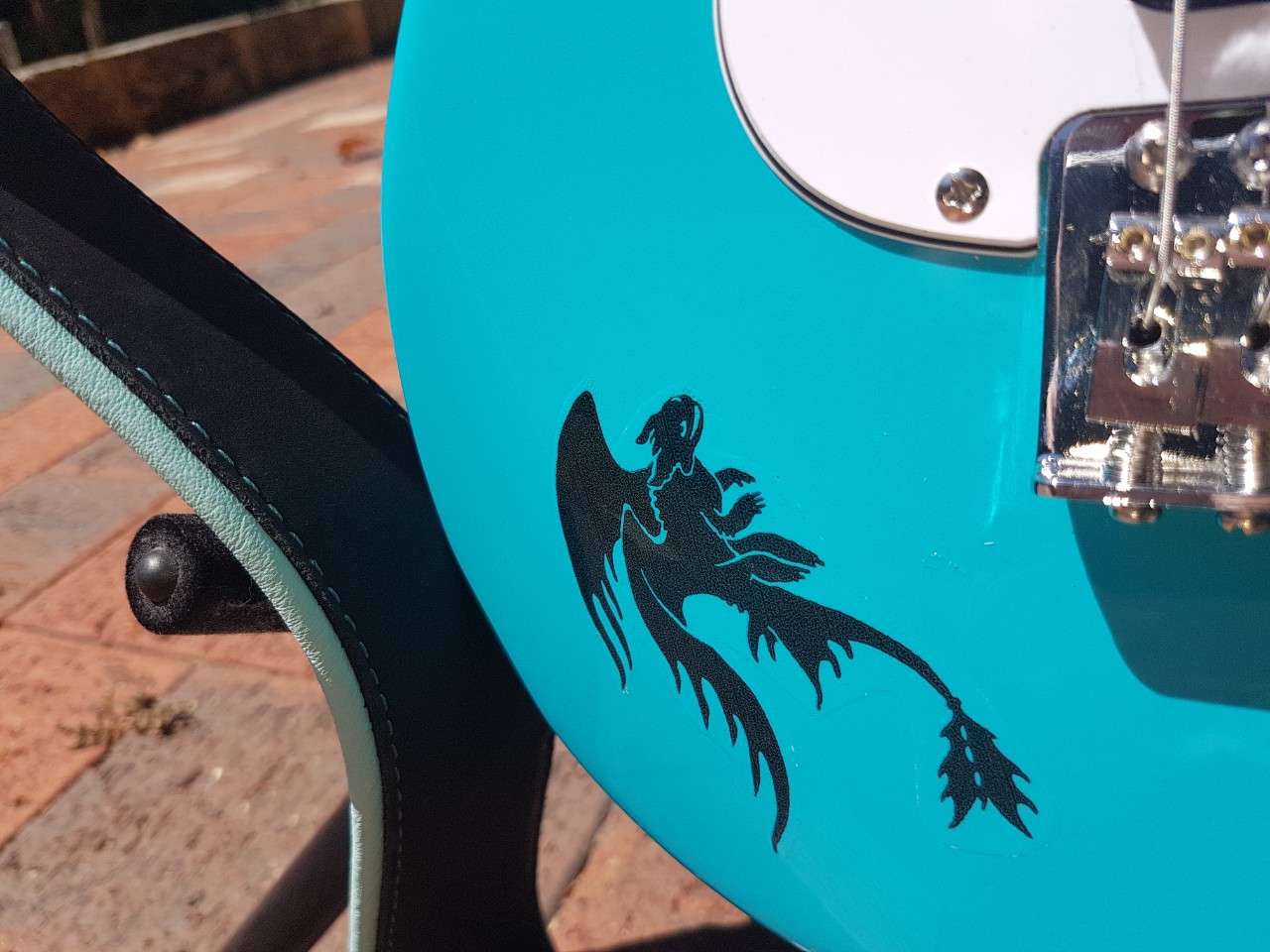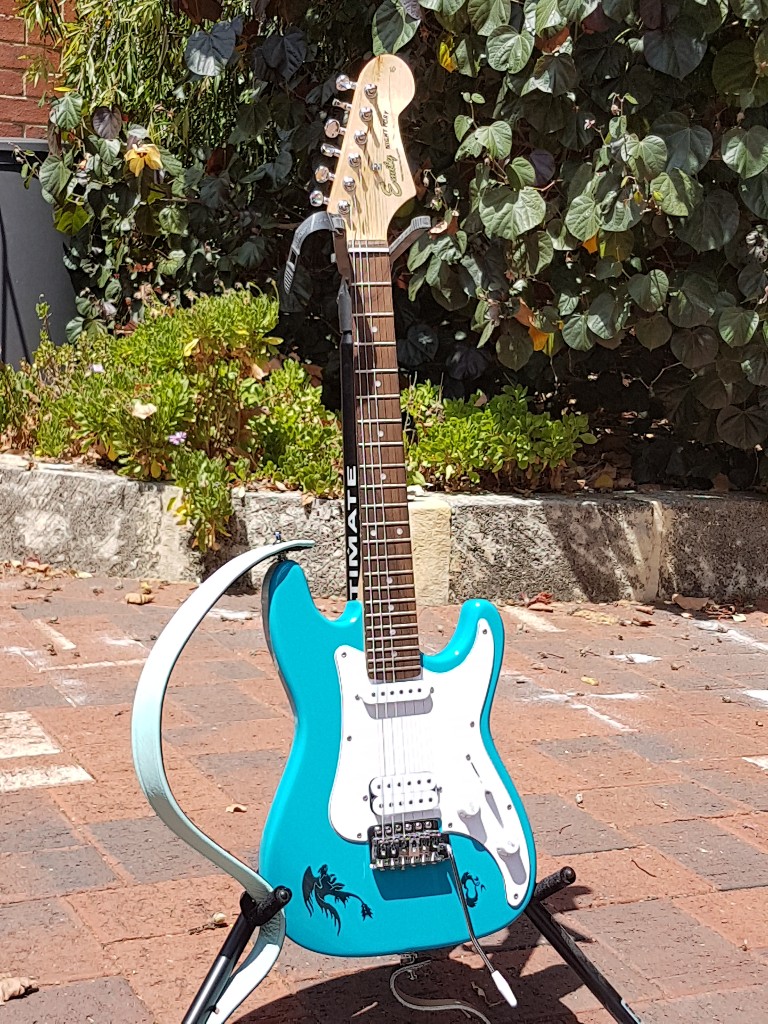 The headstock decal is from Rothko and Frost, who were kind enough to provide a second one free of charge when the first melted into a Salvador Dali droopy looking affair when sprayed with acrylic (from the dregs of the can. I recommend avoiding near empty cans). Top service from R&F though ! Only upgrade was addition of grover strap locks - which seem smaller than others I have used ? and hence well suited to a 2/3 sized model. Finished with nice pale blue leather strap from an Aussie supplier.