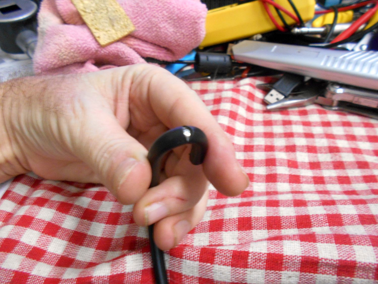 While holding the cable bent back on itself in my fingers, I used the craft knife to cut through the outer-sheathing of the cable, exposing the braid underneath it, while at the same time being very careful not to nick any of the strands of wire in the braiding: