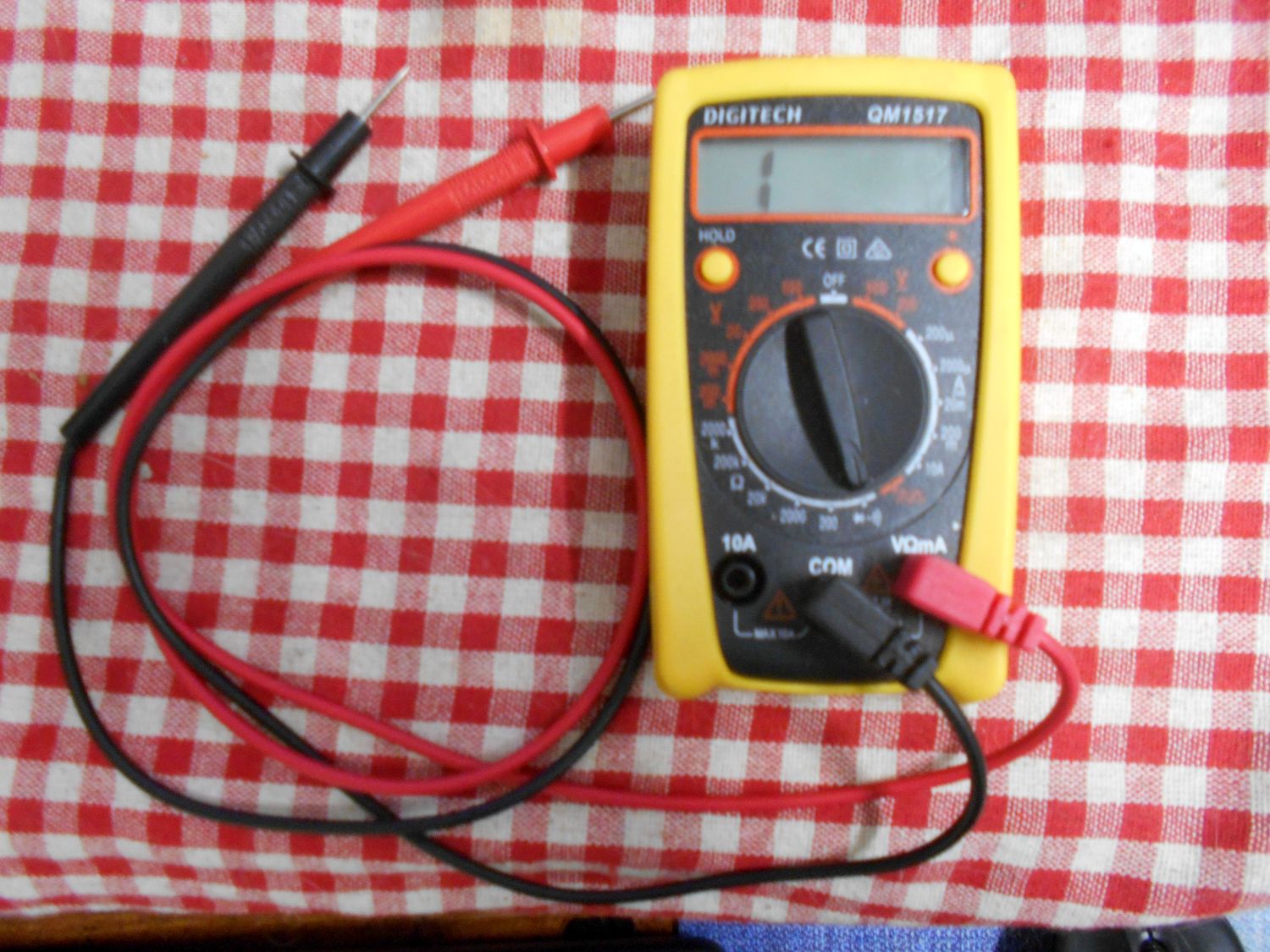 First of all, set your Digital Multimeter to either a low ohms (say 200 Ohms) range setting, or, if your Digital Multimeter has one, the Diode/Continuity Test setting (I've shown it set it to Diode/Continuity Test):