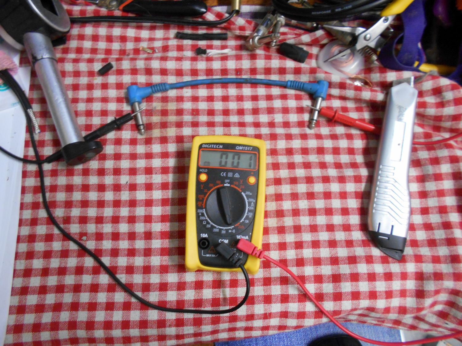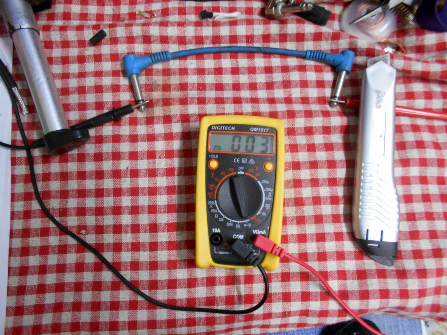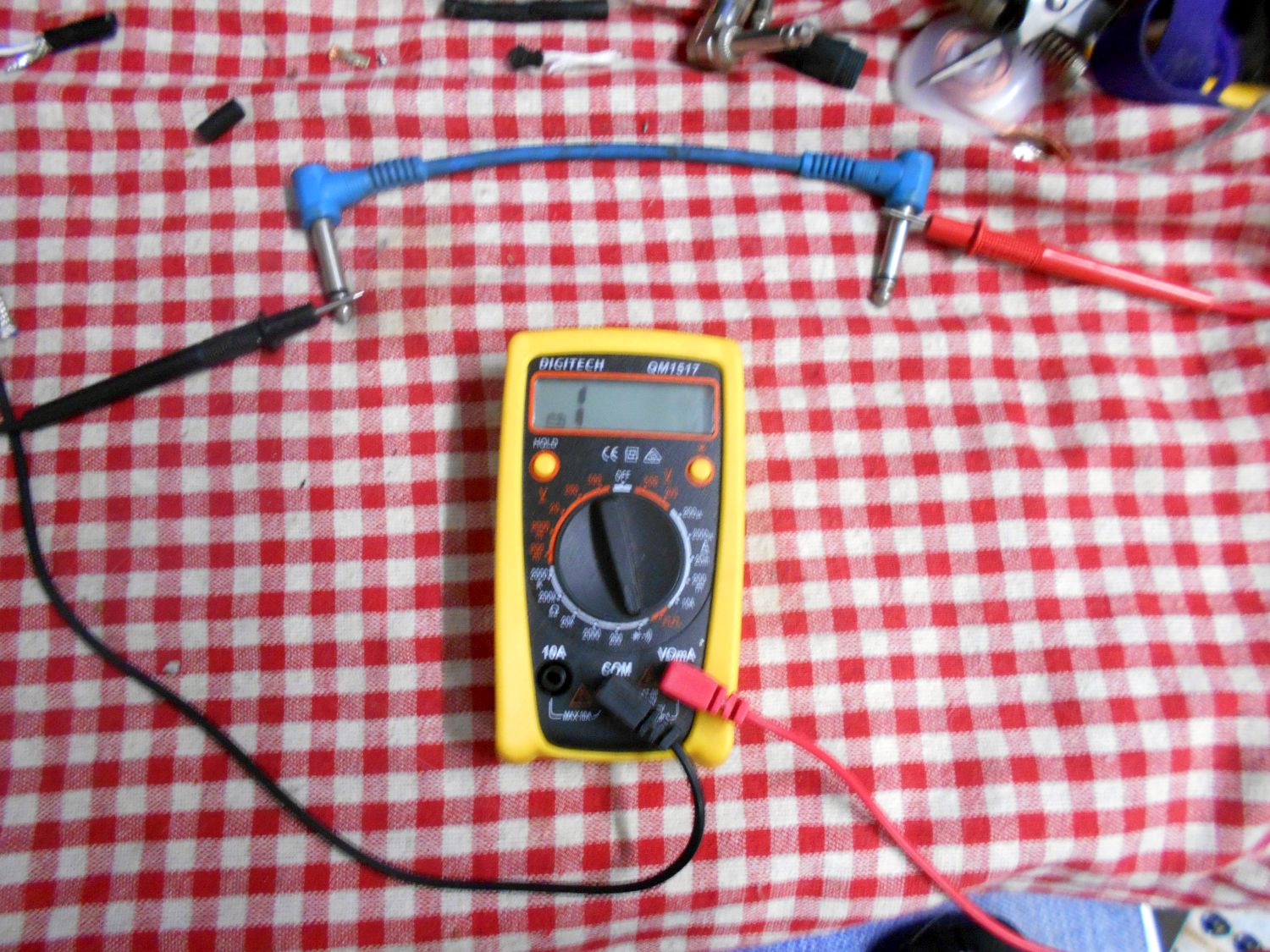 And as a bonus, here's how to test your newly-made DIY Instrument lead with a Digital Multimeter to ensure that it is a good one, note that I'm using a short blue pedal patch-lead for demonstration purposes, if your new DIY Instrument lead passes all of the following tests, then you have a good working lead: