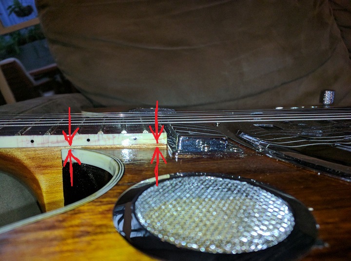 When I set it up initially I thought the action was fine but then I screwed down the resonator cone and found the strings were touching the fret board, only just so I place a thin strip of wood under the pickup, about 1.5mm and this worked perfectly. Your fret board does look a little lower. you don't seem to have much room between the resonator top plate and the end of the fret board (to fit the pickup), with mine I glued the neck in position with the pickup in place, there was about 1-1.5mm gap between the end of the neck and the back of the body socket and being a wedge shape the neck pulled in tight with the socket. This put the measurements out slightly (nut to 12 fret to bridge) but the intonation seems spot on. Remember when you screw down the resonator cone it has to be slightly angled so the lighter strings are slightly shorter.