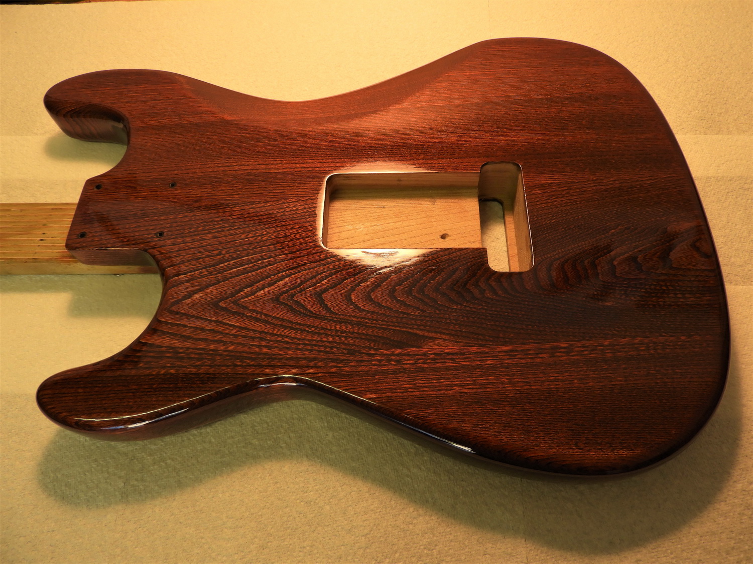 Finally after 50 coats of Tru-Oil (one large bottle) and patience. As mentioned above the deep black V grain took some filling but it is now glass-smooth.
