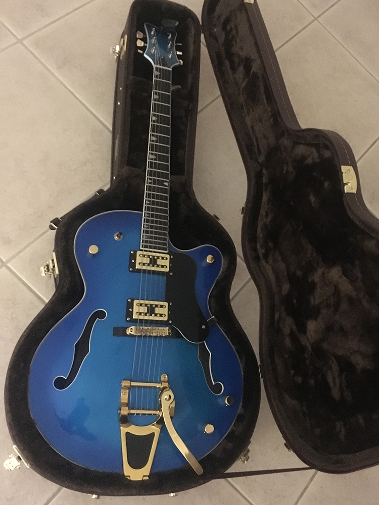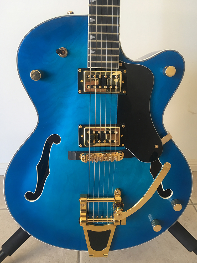 Beautifully understated but luxurious at the same time with the gold hardware the wonderful blue finish and importantly the body cavity having a lick of black to make it like looking into the abyss.